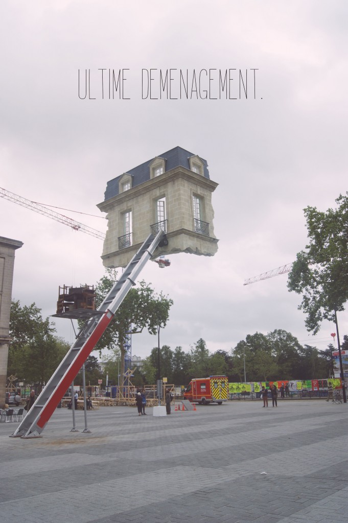 Croyez le ou non, mais cette oeuvre, L’Ultime Déménagement, est en fait un pan d’une vraie maison. Oui oui, une vraie maison avec de la vraie pierre qui est suspendue au bout d’une échelle, en plein Nantes !