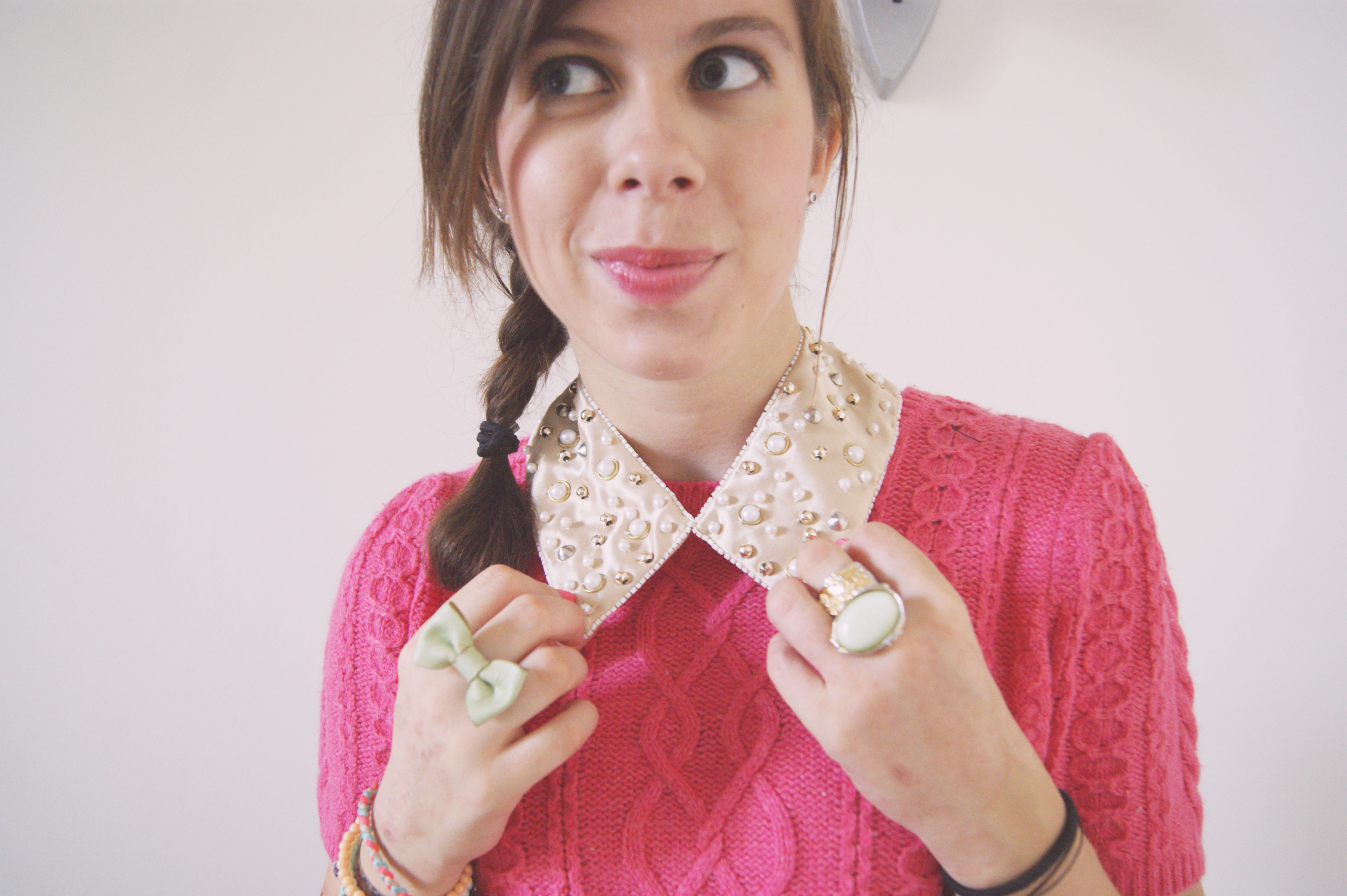 Pour ce premier look, je suis partie d’une pièce forte : le col bijou. Eh oui, cet hiver encore, il va falloir composer ses tenues avec des cols claudine, des cols bijoux, etc… Et ça, c’est le vrai bon plan car ça habille n’importe quelle tenue ! Vous pouvez même ressortir vos vieux pulls de l’année dernière, ils retrouveront vite une nouvelle jeunesse grâce aux cols ! Et pour aller avec ce col bijou, j’ai essayé de faire simple : un petit pull, un jean slim noir et j’ai craqué devant cette paire d’escarpin à tout petit talon pailletée ♥