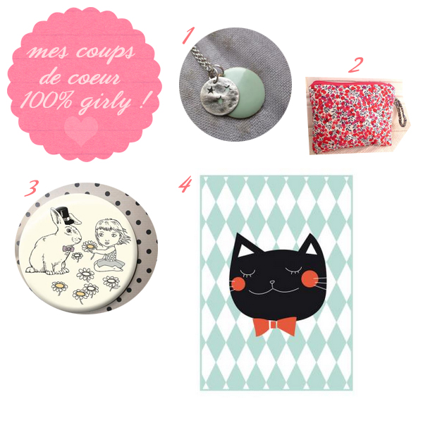 1. Sautoir La Tête Dans Les Etoiles – Jadheo (9.45€ ♥) – 2. Pochette liberty – Ernest est Céleste (14.80€ ♥) – 3. Miroir « la petite fille et le lapin » – Briki Vroom Vroom (6.50€ ♥) – 4.Affiche Chat – Balthazar (15€ ♥)