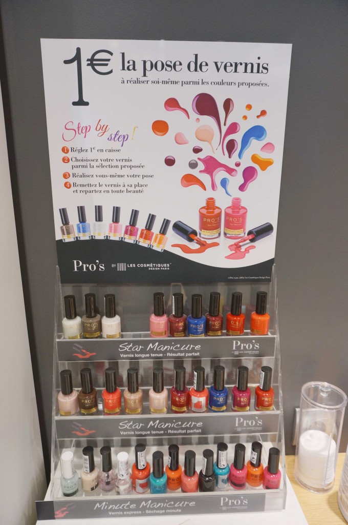 D’ailleurs, en parlant de vernis, ils ont décidé de faire un concept assez sympa de nail bar à disposition des clientes ! Je ne sais pas vous, mais ça m’est déjà arrivé de me retrouver loin de chez moi en galère de manucure et d’avoir envie de me refaire les ongles sans y lâcher 25 euros. Eh bien, ici, contre la somme de 1€, vous choisissez l’un des vernis Pro’s disponibles sur le stand et vous pouvez réaliser votre manucure vous-même en 10 minutes, histoire d’être impeccable pour un rendez-vous de dernière minute par exemple ;)