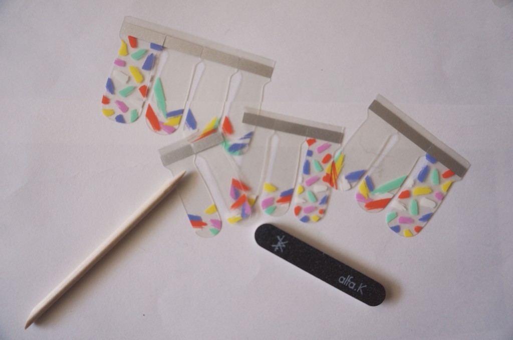 Alors là, c’est le moment où on met en application tout ce que l’on a appris depuis la maternelle en matière de pose de stickers. Et croyez moi, un petit stage de remise à niveau serait le bienvenu, car la pose de patchs, sur le papier, ça a l’air de se faire les doigts dans le nez (quoique ce n’est pas pratique quand tu poses du vernis… Blague pourrie, bonjour !), mais en réalité, c’est un poil plus compliqué. Surtout quand on n’a pas les ongles longs comme moi.