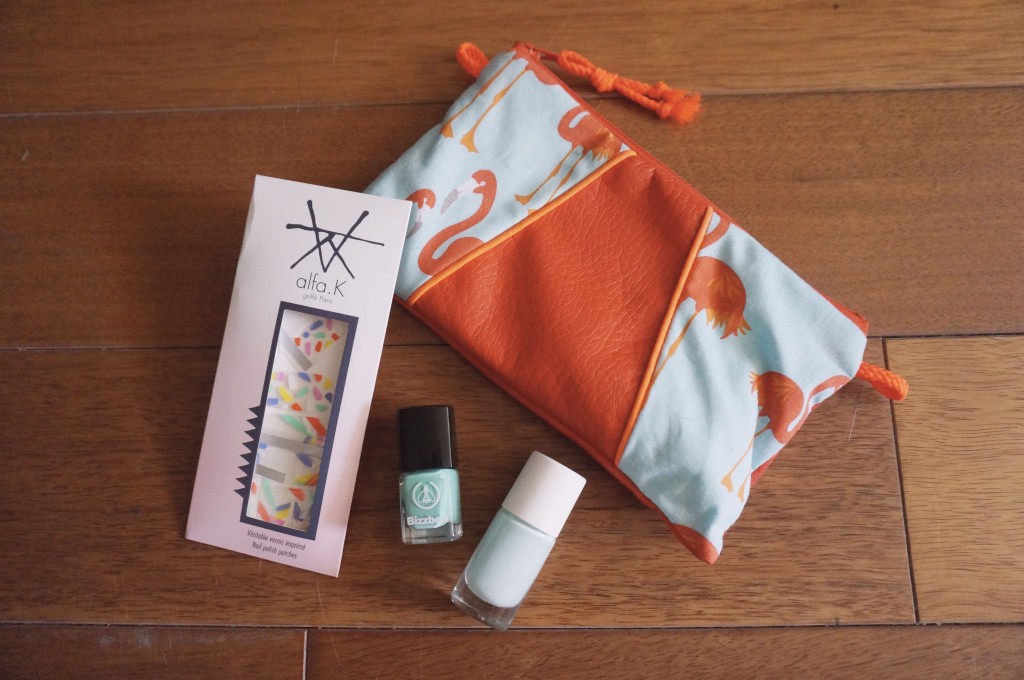 Le lendemain de la pose, j’ai posé mon top coat sur les ongles qui avait le nail patch, histoire que ça tienne sur la durée. Et voilà le travail ! J’ai une manucure plutôt fun, qui va bien avec ma nouvelle pochette et qui sent bon l’été !