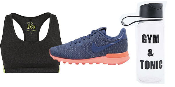 Soutien gorge de sport Even&Odd Active – 18€ / Baskets Nike – 60€ / Gourde Urban Outfitters – 12€