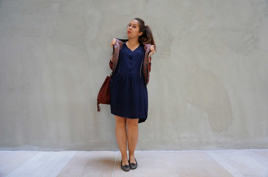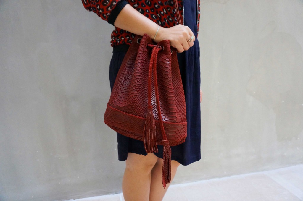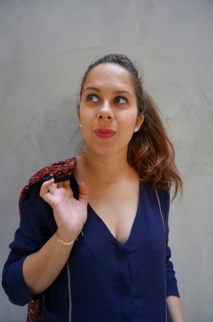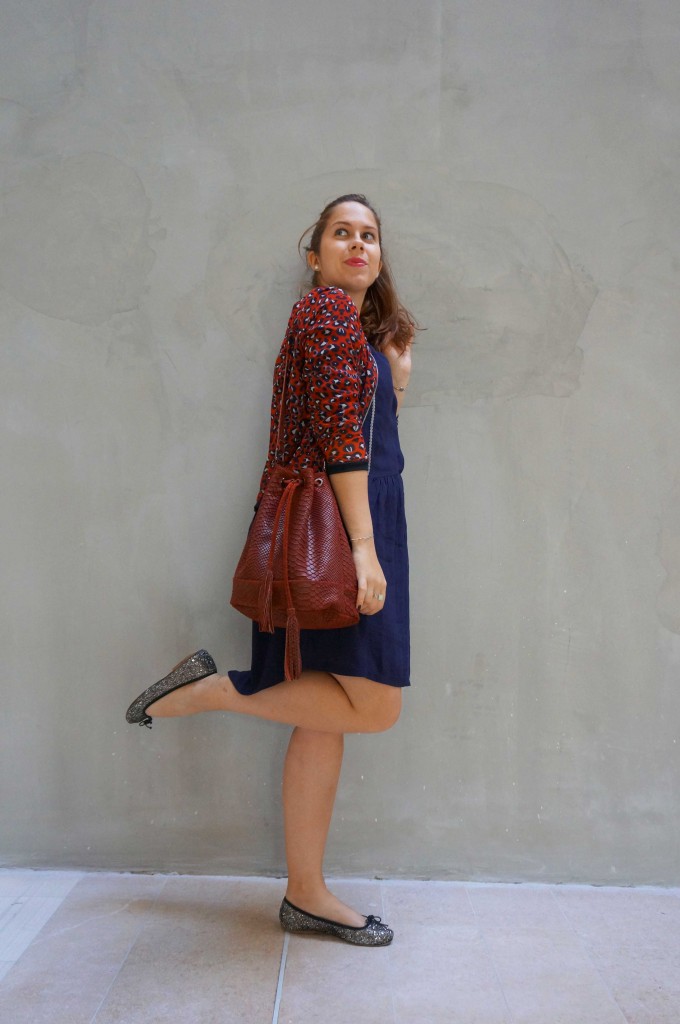 Je ne sais pas si j’y consacrerai un article, mais c’est vrai qu’en ce moment, je suis en plein tri de mon dressing. J’en ai un peu ras-le-bol d’accumuler des pièces « tendances » simplement parce que je suis cataloguée comme une blogueuse mode. A l’approche de la trentaine, j’ai plutôt envie d’avoir un dressing minimaliste, avec des pièces plus travaillées mais tellement faciles à porter au quotidien. Alors, le look que je vous présente aujourd’hui, c’est un peu un mix de ce que j’aime porter en ce moment : des pièces classiques comme ma nouvelle robe bleu marine Red Soul et des pièces un peu plus originales, comme mon nouveau sac seau en cuir python Rebelle Etoile ou bien mes ballerines à paillettes Anniel que je possède depuis près de 3 ans maintenant.