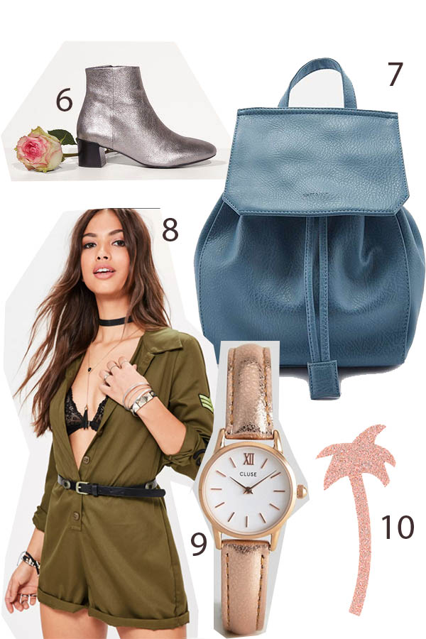 Jolie sélection ! J’aime bcp les boots argentées , La combishort kaki et la broche palmier ! J’ai fait comme toi par internet !