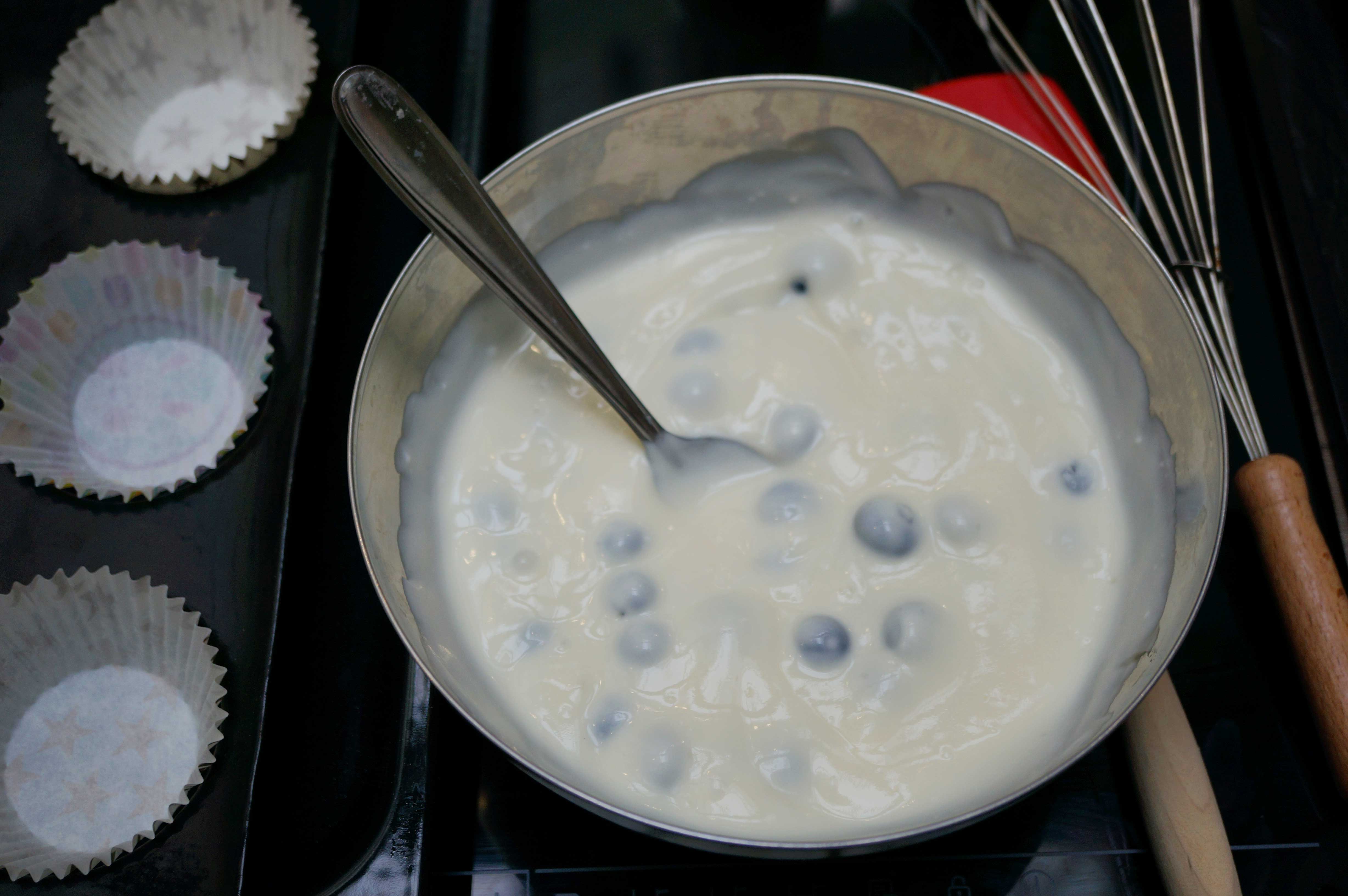 Pendant que vos petits gâteaux cuisent, prenez un autre saladier. Mélangez délicatement les yaourts avec 1/3 des myrtilles (soit 200g) et le miel.