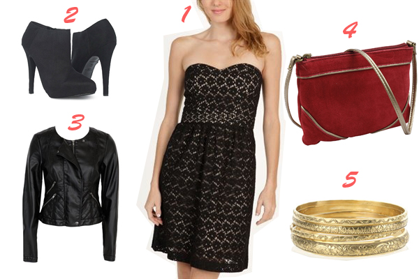 1. Robe bustier en dentelle – Pimkie (35.99€ ♥) – 2. Low boots – New Look (24.99€ ♥) – 3. Perfecto – Pimkie (45.99€ ♥) – 4. Pochette en cuir de vachette – Monoprix (30€ ♥) – 5. Lots de bracelets – Accessorize (6.90€ ♥)