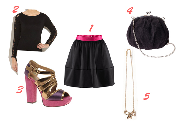 1. Jupe bicolore – H&M (24.99€ ♥) – 2. Pull noir uni avec empiècements en dentelle – New Look (29.99€ ♥) – 3. Sandales à talons carrés – Asos (65.23€ ♥) – 4. Sac en dentelle – Stradivarius (15.95€ ♥) – 5. Collier noeud – Pull and Bear (9.99€ ♥)