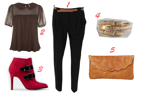 1. Pantalon cigarette – Pimkie (25.99€ ♥) – 2. Top col claudine – Naf Naf (25€ ♥) – 3. Bottines à boucles – Bershka (59.99€ ♥) – 4. Bracelet griffe – Bershka (14.99€ ♥) – 5. Pochette en cuir camel – Topshop (39€ ♥)
