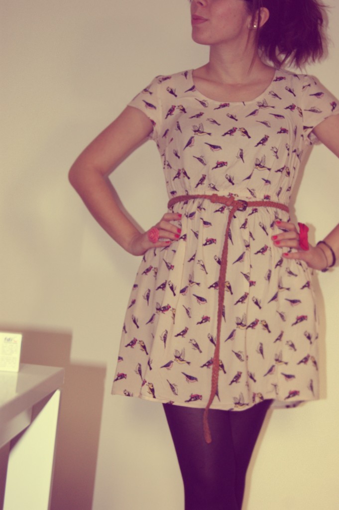 Oui, oui, je sais.. les soldes ne sont même pas terminées que je commence déjà à fouiner dans les rayons des nouvelles collections, à la recherche de petites merveilles. Comme cette robe, dénichée chez le suédois (évidemment) dans les rayons Divided. Une robe toute légère, avec plein de jolis oiseaux dessus. Elle est certes plus légère qu’une robe d’hiver, mais franchement avec un bon manteau et des collants, ça passe tout seul. A tel point que je l’associe régulièrement avec un petit gilet, mes bottines de Mary Poppins (encore !) et le tour est joué ^^