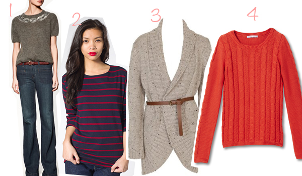 1. Pull avec appliques à paillettes – Zara (49.95€ ) – 2. Pull rayé – American Apparel (50€ ) – 3. Maxi gilet ceinturé – Pimkie (39.99€ ) – 4. Pull à mailles torsadées – Somewhere (44.90€ )