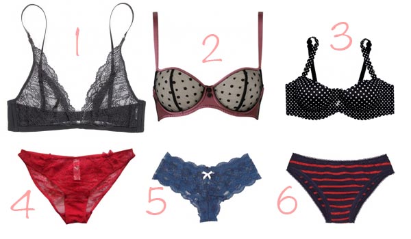 1. Soutien-gorge triangle en dentelle – Calvin Klein (23€ au lieu de 39 ♥) – 2. Soutien gorge corbeille à pois – Implicite (36.40€ au lieu de 52€ ♥) – 3. Soutien gorge Body Touch par Agnès B – Dim (24€ au lieu de 30€ ♥) – 4. Culotte en dentelle – Etam (8€ au lieu de 16€ ♥) – 5. Shorty en dentelle –Eberjey (22.20€ au lieu de 37€ ♥) – 6. Culotte rayée en lurex – Petit Bateau (6.60€ au lieu de 11€ ♥)