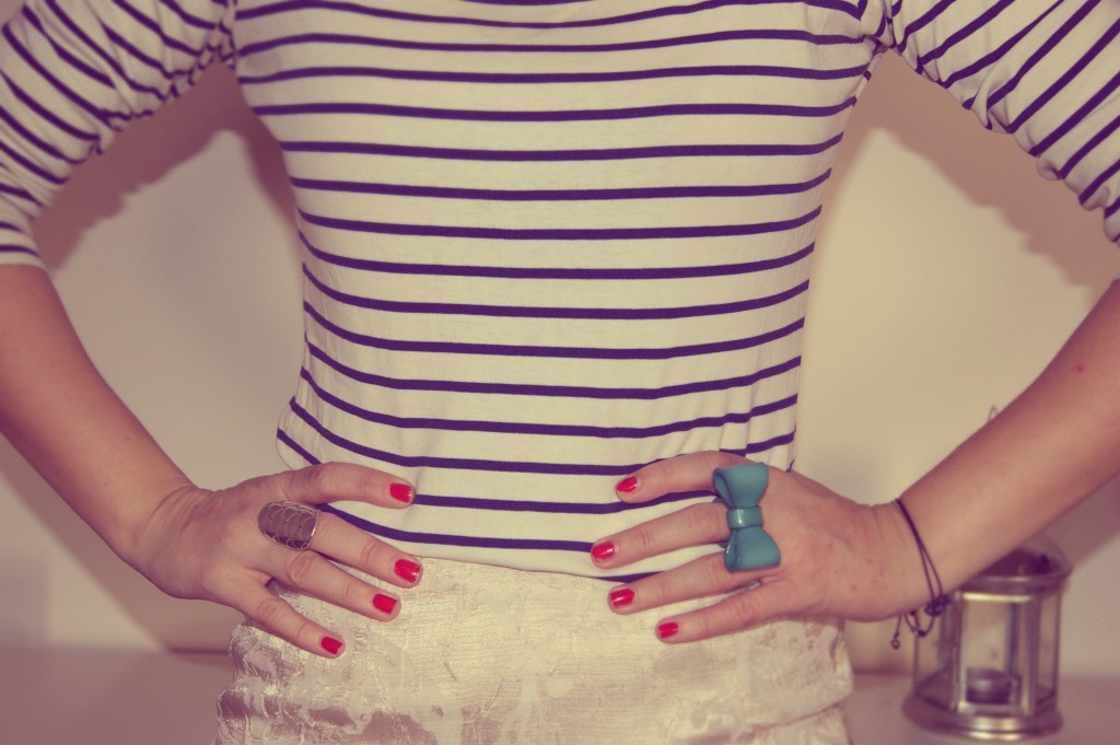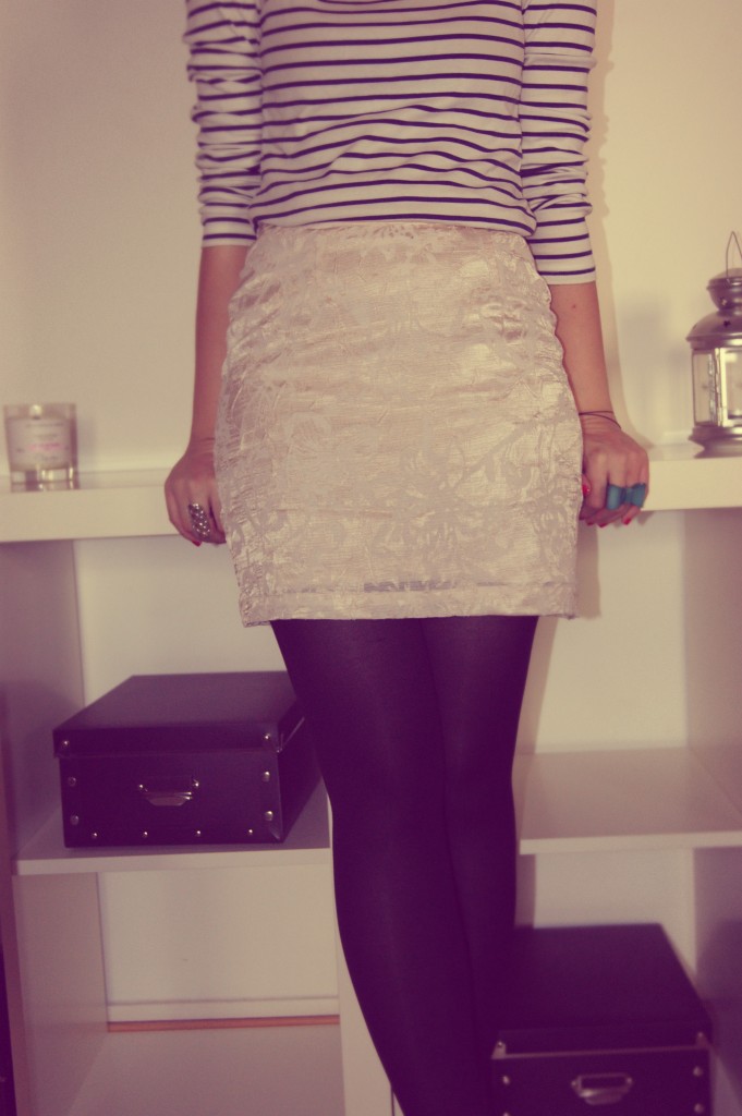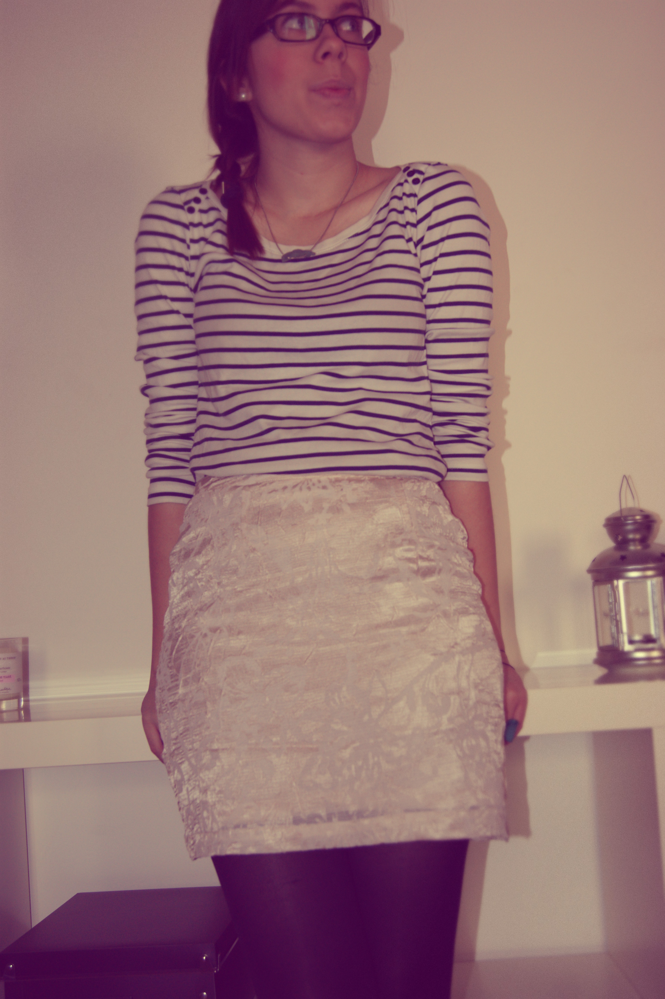 J’ai eu un peu peur du bling bling en voyant « jupe dorée » mais finalement ça te va bien ! L’association avec la marinière est bien trouvée :)