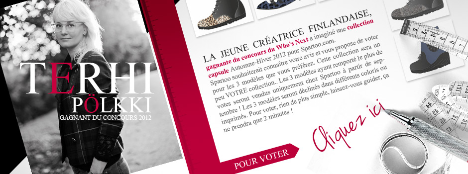 Et petit bonus, pour les fans de mode ! Du 23 au 29 Avril, votez sur le site (ou en cliquant via la bannière) pour l’un des 5 modèles crées par la créatrice finlandaise Terhi Polkki pour Spartoo. A la fin du vote, vos 3 modèles préférés seront crées et vendus en exclusivité sur le site :)
