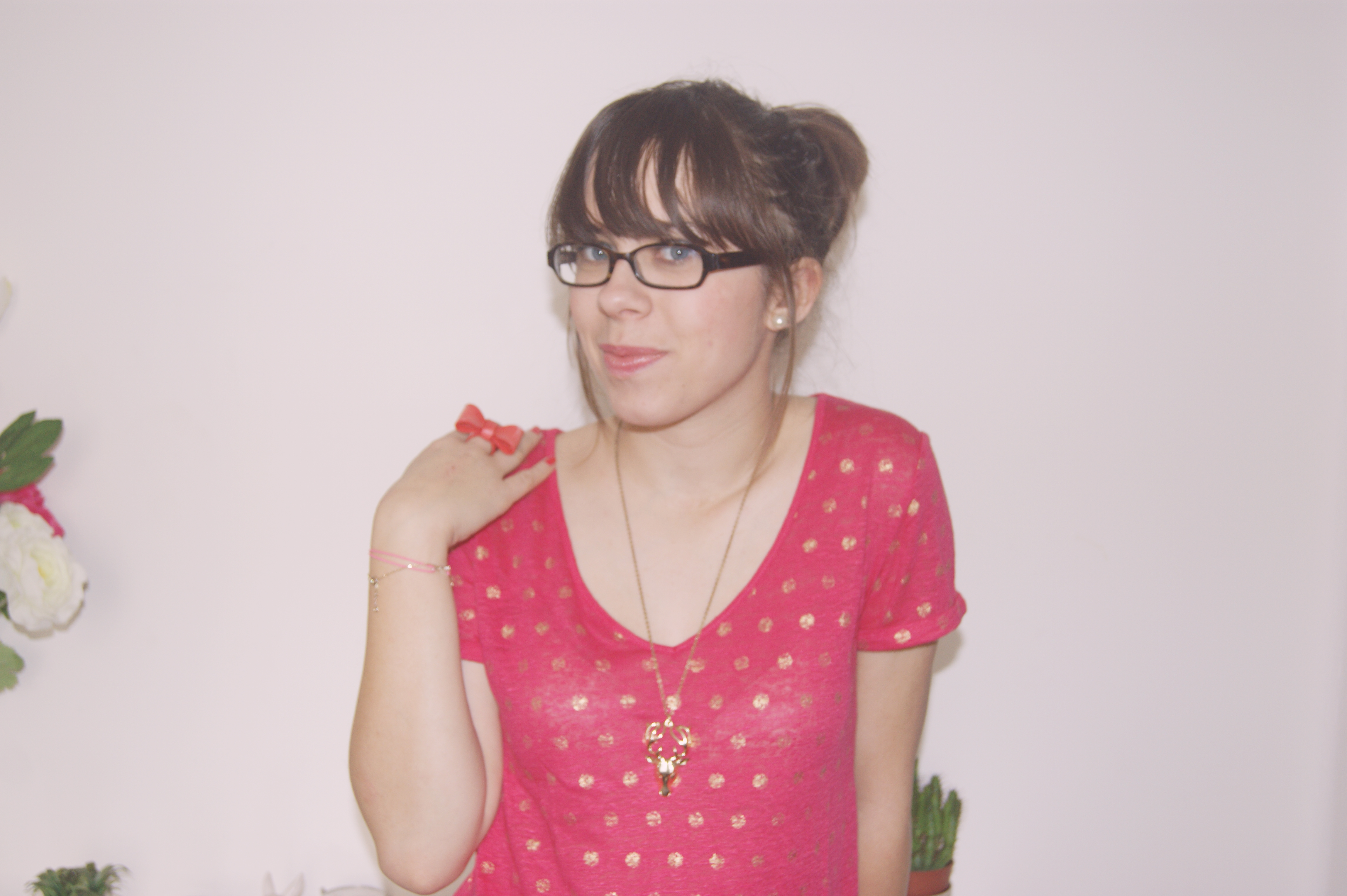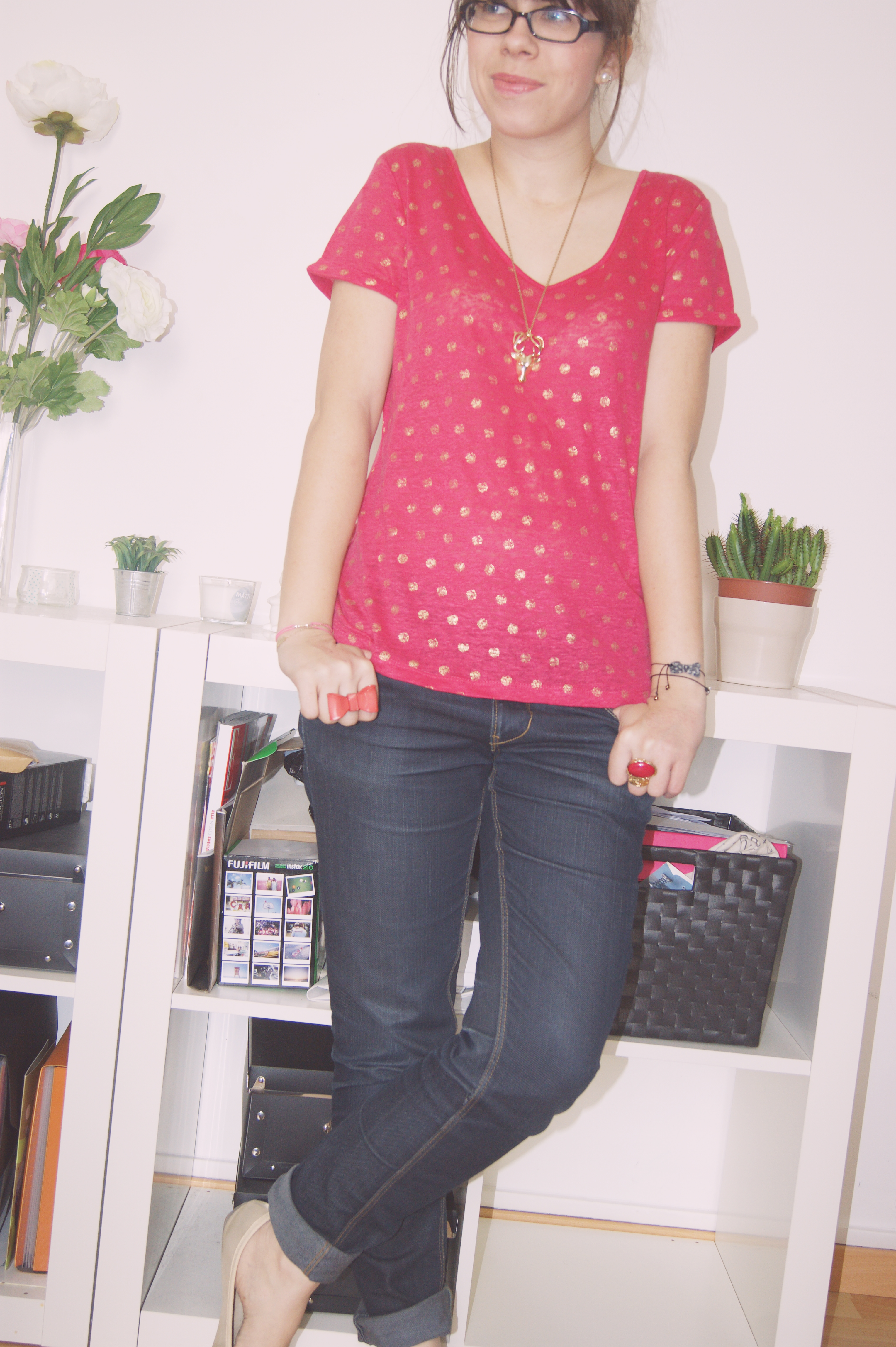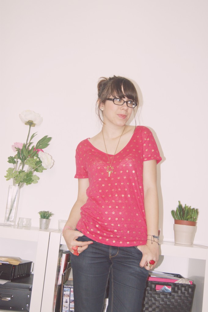 S’il y a bien une couleur que je vais adopter tout l’été, c’est le rose. Après le cas de la jupe tutu, voici venu le tee-shirt léger, léger, léger… ! Déniché ce weekend chez Naf Naf, j’ai immédiatement craqué pour sa matière et pour ses petits pois dorés, qui rendent ce tee-shirt à la coupe basique tout de suite plus original et girly ! Aussitôt vu, aussitôt adopté et aussitôt montré porté sur le blog :)