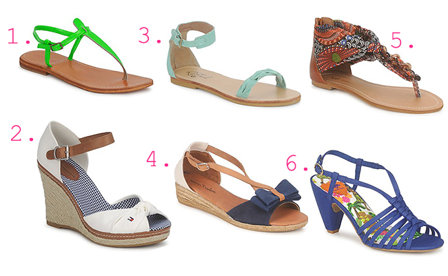 1. Sandales vertes fluo – Les Tropéziennes par M. Belarbi (39€ ♥) – 2. Sandales compensées – Tommy Hilfiger (90€ ♥) – 3. Sandales vert d’eau – Rip Curl (40€ ♥) – 4.Sandales légèrement compensées – Betty London (59€ ♥) – 5. Sandales à tissu ethnique – Chocolate Schubar (49€ ♥) – 6. Sandales à talons – Rocket Dog (55€ ♥)