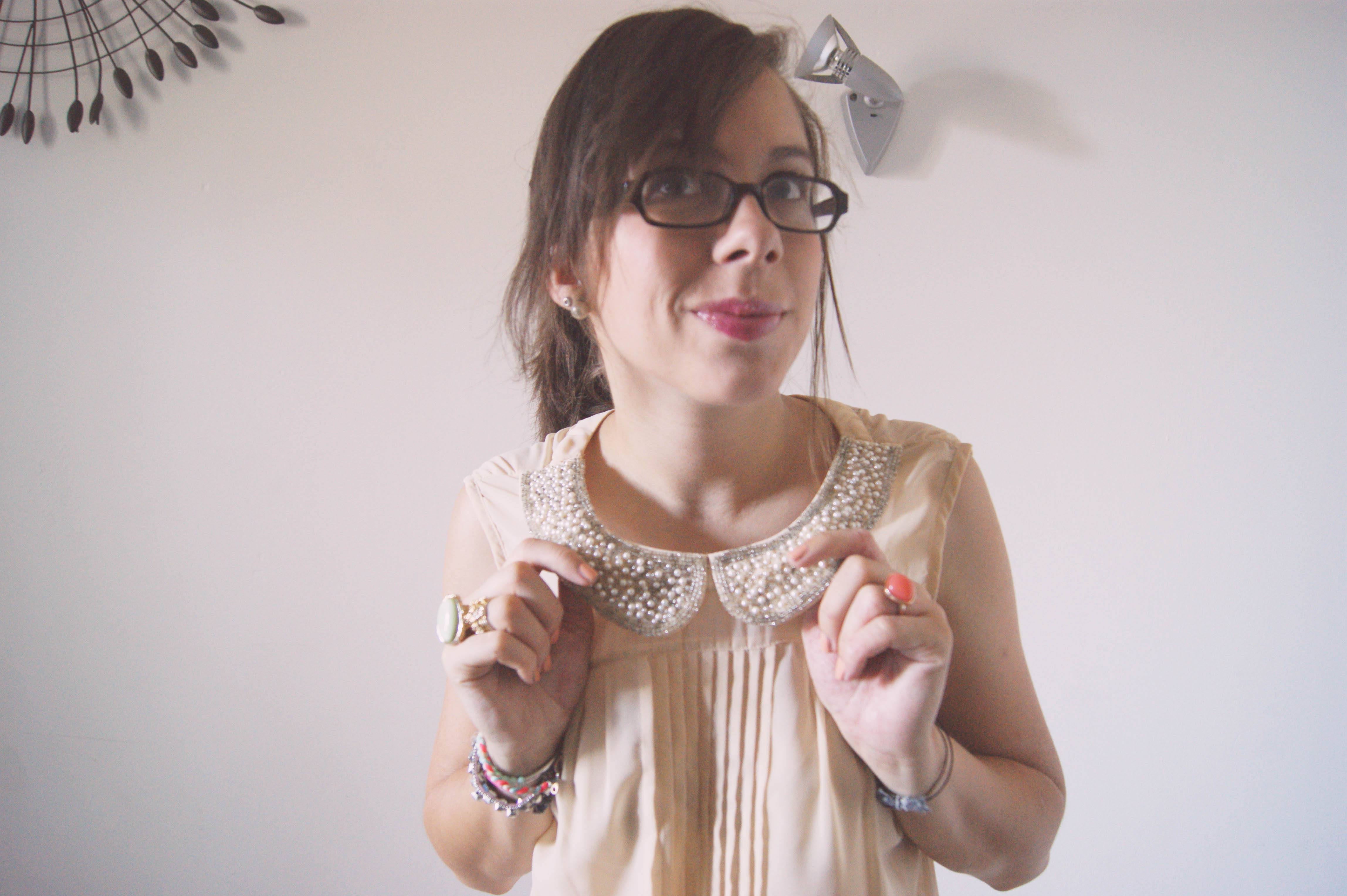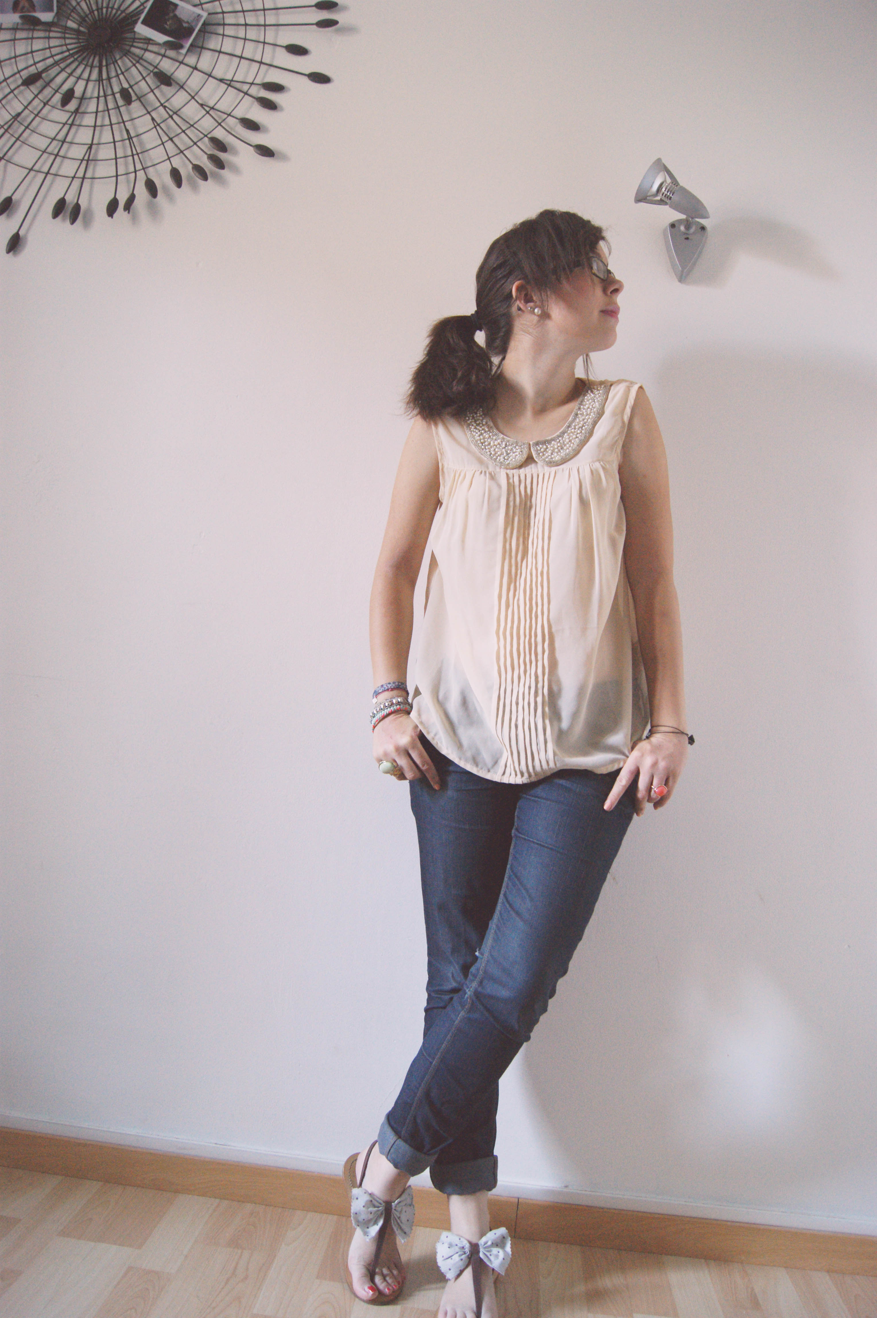 Ta blouse à col claudine est très mignonne ! Tu la portes simplement, mais c’est très réussi.