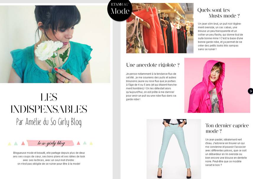Alors pour découvrir mes conseils, mes idées de tenues pour l’été et ma vision de la mode, deux solutions : soit se faire un petit plaisir et craquer pour la nouvelle collection d’Etam et ainsi peut être faire partie des 1.000 chanceuses, soit cliquer sur ce lien pour découvrir le webzine dans son ensemble ! Bonne lecture ♥