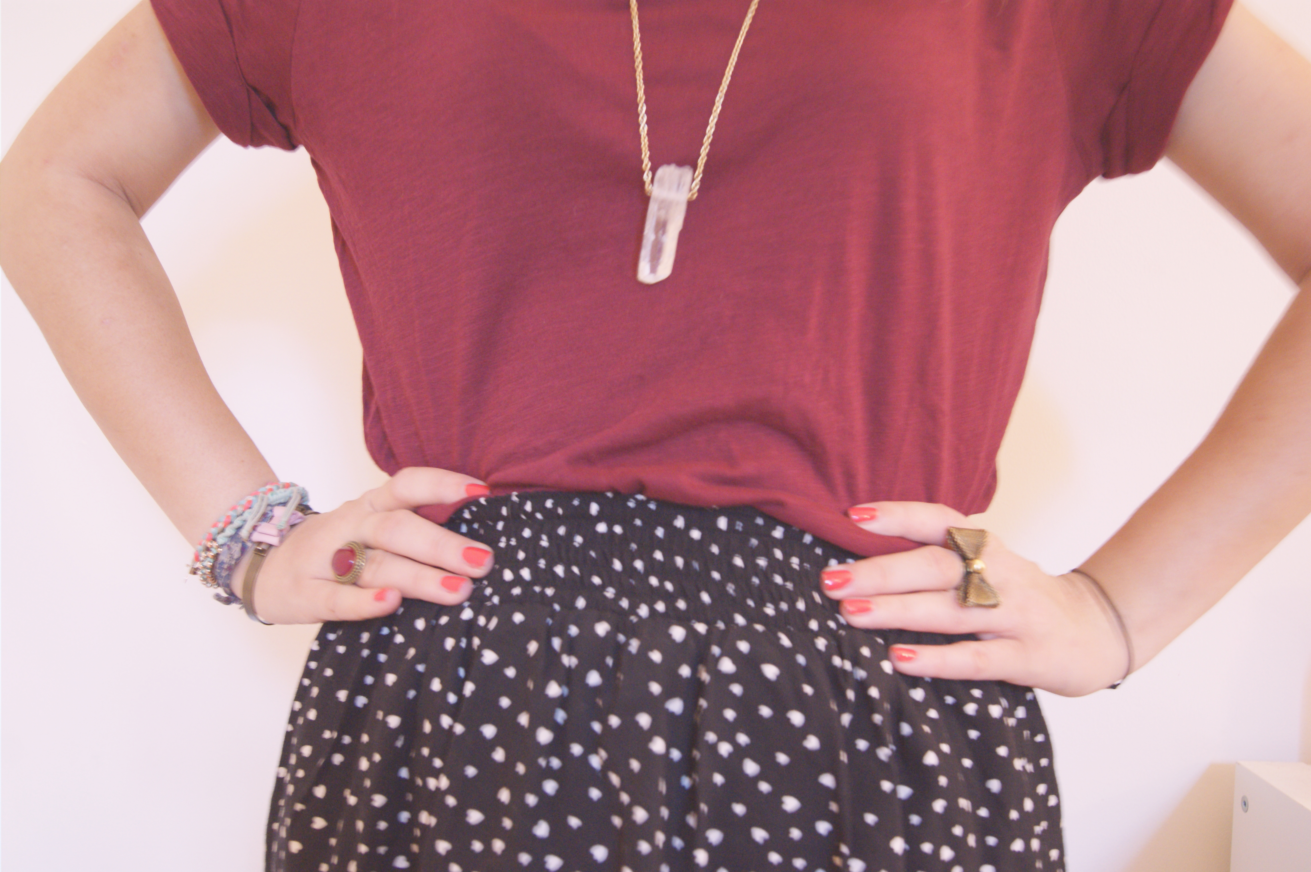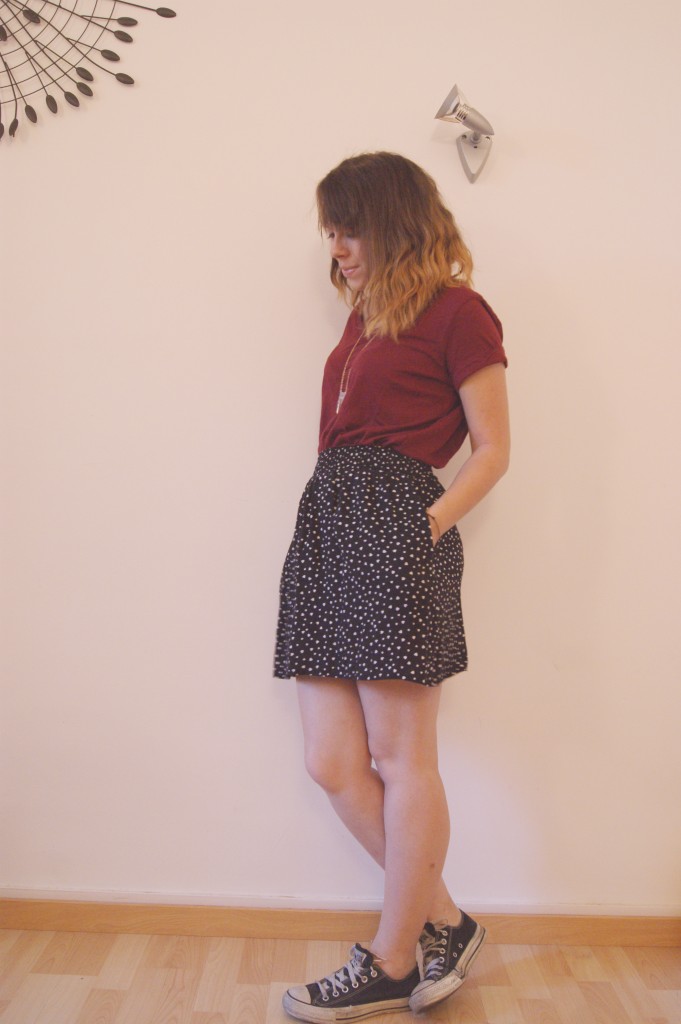Bref, tout ce blabla pour dire que la tenue d’aujourd’hui, c’est typiquement une tenue so girly blog. J’ai refait le plein de tee-shirts basiques chez le Suédois et celui-ci et sa jolie couleur bordeaux s’est forcément retrouvé dans mon dressing. J’y ai associé une jupe que vous avez déjà vue plusieurs fois ici et ma vieille paire de Converse bien destroy (parce qu’une vraie paire de Converse ne devient portable que quand elle a bien vécue ^^). Et voila, plus qu’à partir au travail =)