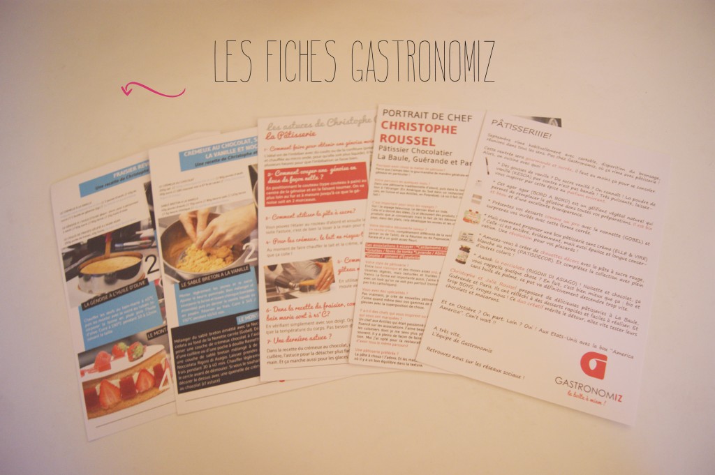 Sans plus de blabla, il est temps d’en dévoiler le contenu ! Si vous ne l’avez toujours pas reçue, je ne vous conseille pas de lire cet article ;) Sinon vous allez vous faire spoiler ! Bon, comme dans chaque box, on retrouve des fiches avec une sorte de fiche-résumé de la box (quel est le contenu, le petit mot de l’équipe Gastronomiz..), deux fiches recettes (un fraisier et un crémeux au chocolat et sablés bretons) à réaliser avec des ingrédients compris dans la box et un portrait + les astuces de Christophe Roussel, grand pâtissier-chocolatier (le rêve quoi).