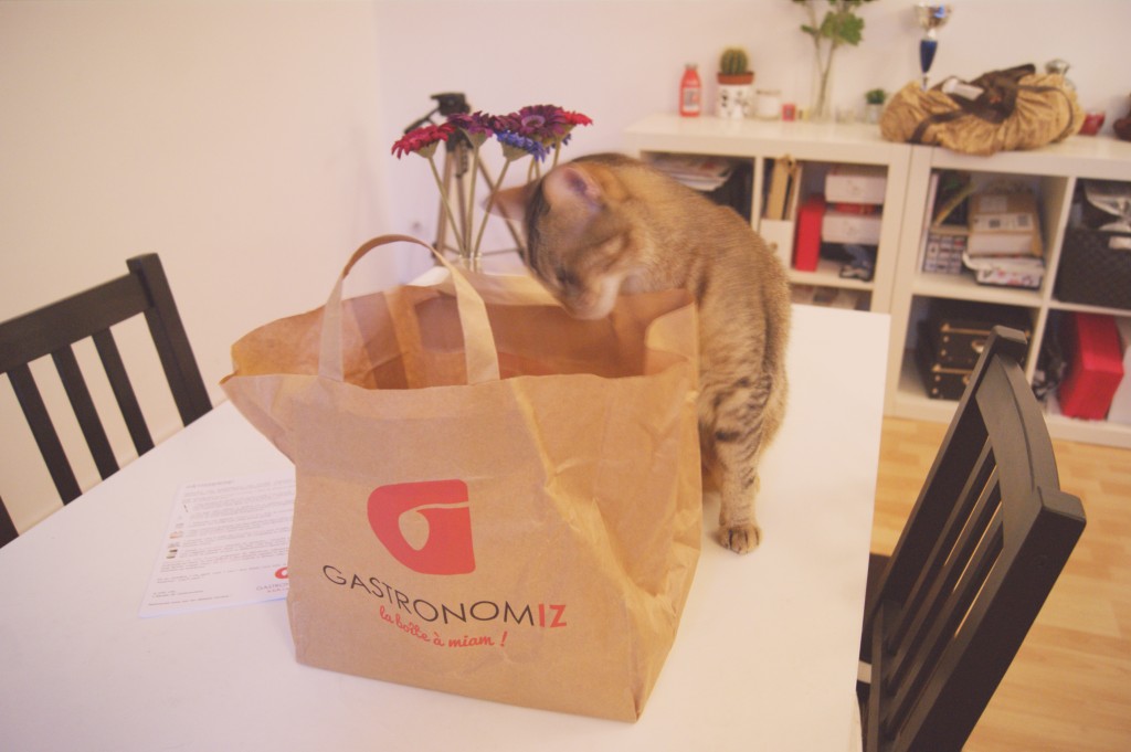 Pour ma part, je suis une nouvelle fois emballée par cette box, mais celle du mois prochain va être juste génialissime puisque le thème est « America America » ! Je l’attends donc avec impatience :)) Et apparemment, je ne suis pas la seule à adorer la Gastronomiz, car j’ai pris Guignette sur le fait : elle a fait sa curieuse pendant que j’essayais vainement de prendre les photos pour cet article ! Aussi gourmande que sa maîtresse :D