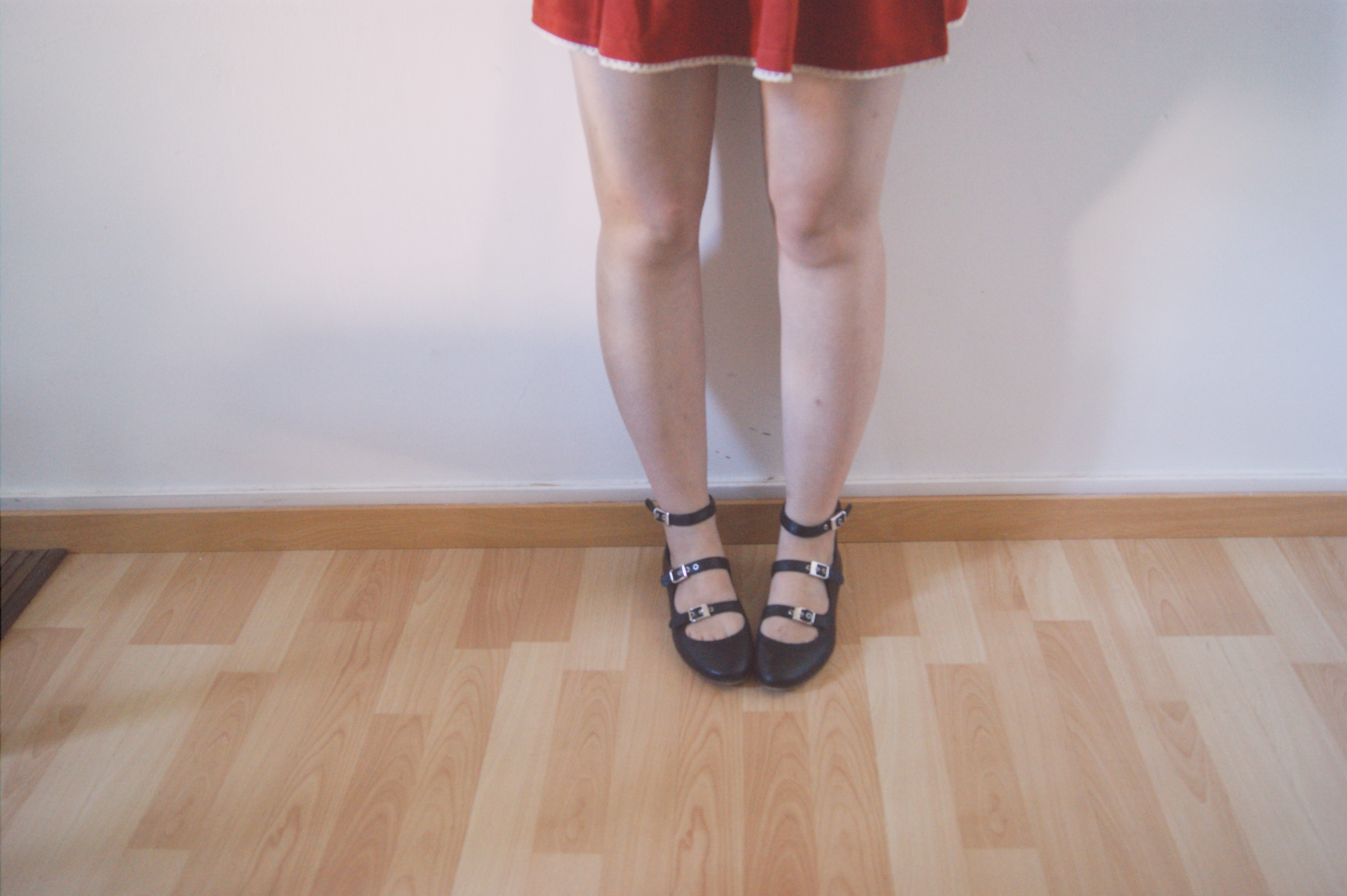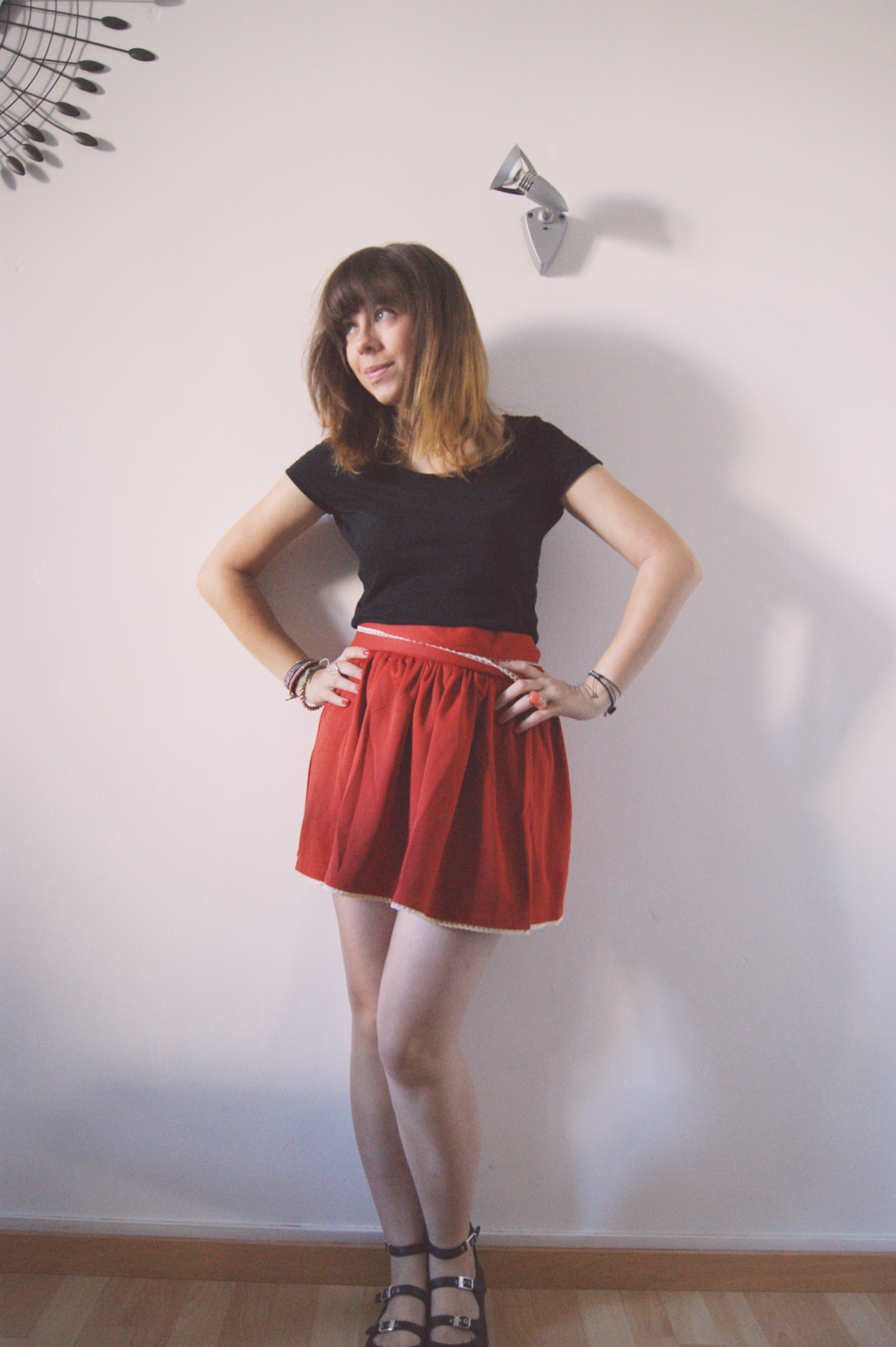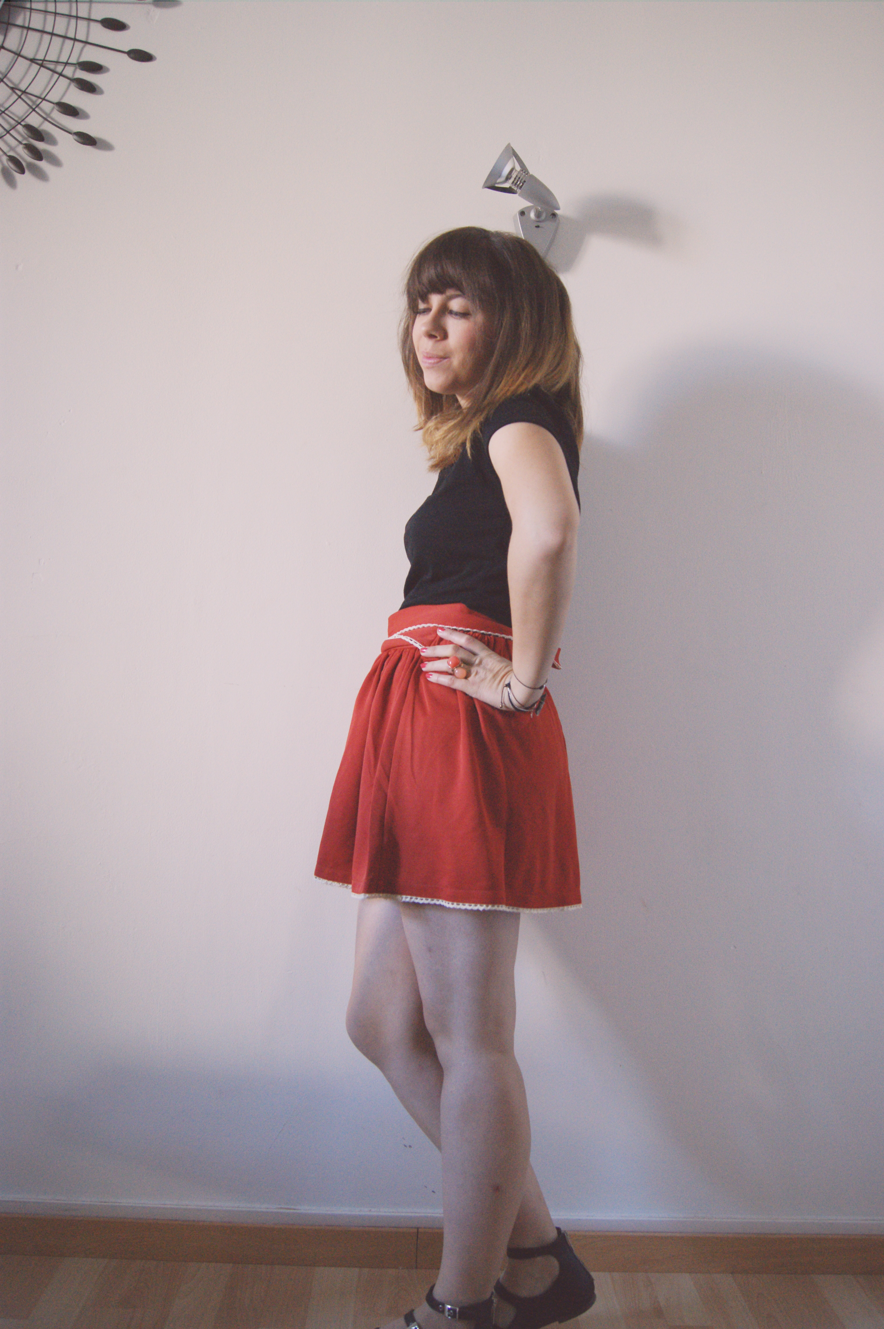 Aujourd’hui, je vous présente un petit look avec des pièces qui sont dans mon armoire depuis quelques semaines déjà, mais que je n’avais pas encore eu l’occasion de vous montrer. Cette jupette couleur brique fait partie de la nouvelle collection Kling et j’ai immédiatement craqué pour sa forme ! J’ai hâte de la porter cet hiver, avec un petit pull et des bottines… mais là, je peux encore la porter en mode « été », donc j’en profite ! Je l’ai associé à un top basique (bon, je dois avouer, j’ai presque plus que des tops basiques dans mon dressing suite à mon vide-dressing) et à mes ballerines New Look en cuir, dénichées en soldes à 15€ au lieu de 49 ! :)