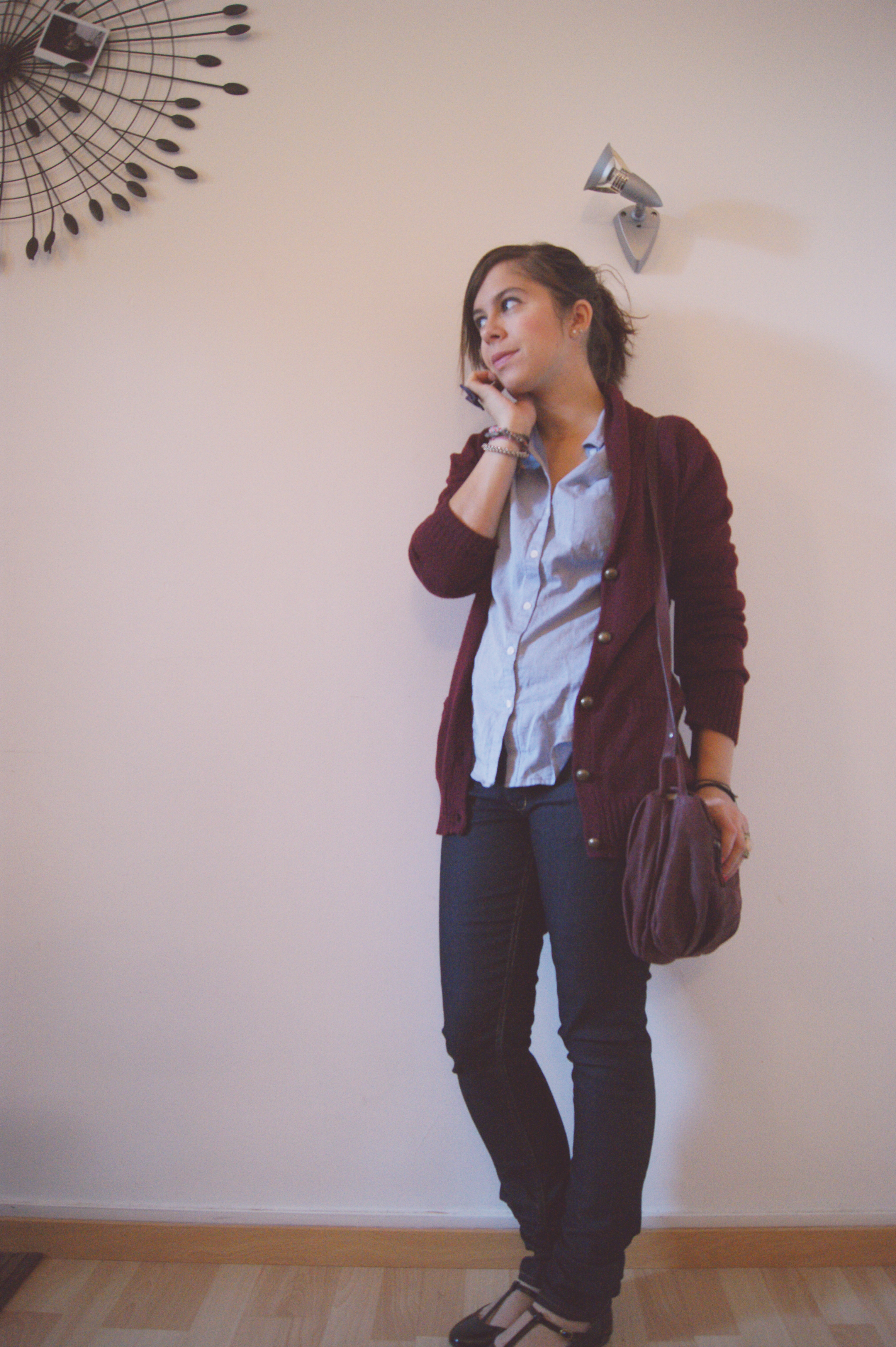 Résultat, voici en photos plus ou moins réussies mon look d’hier. Avec l’arrivée du mistral, impossible de porter jupes et sandales, donc on ressort le jean slim, le vieux gilet et une chemise et voilà, le tour est joué ! Ce gilet, acheté l’année dernière, va encore être bien porté cette année, surtout que la couleur est tendance et assorti à mon sac Nat&Nin ^^ Et niveau chaussures, pour compléter le look, une petite paire de ballerines !