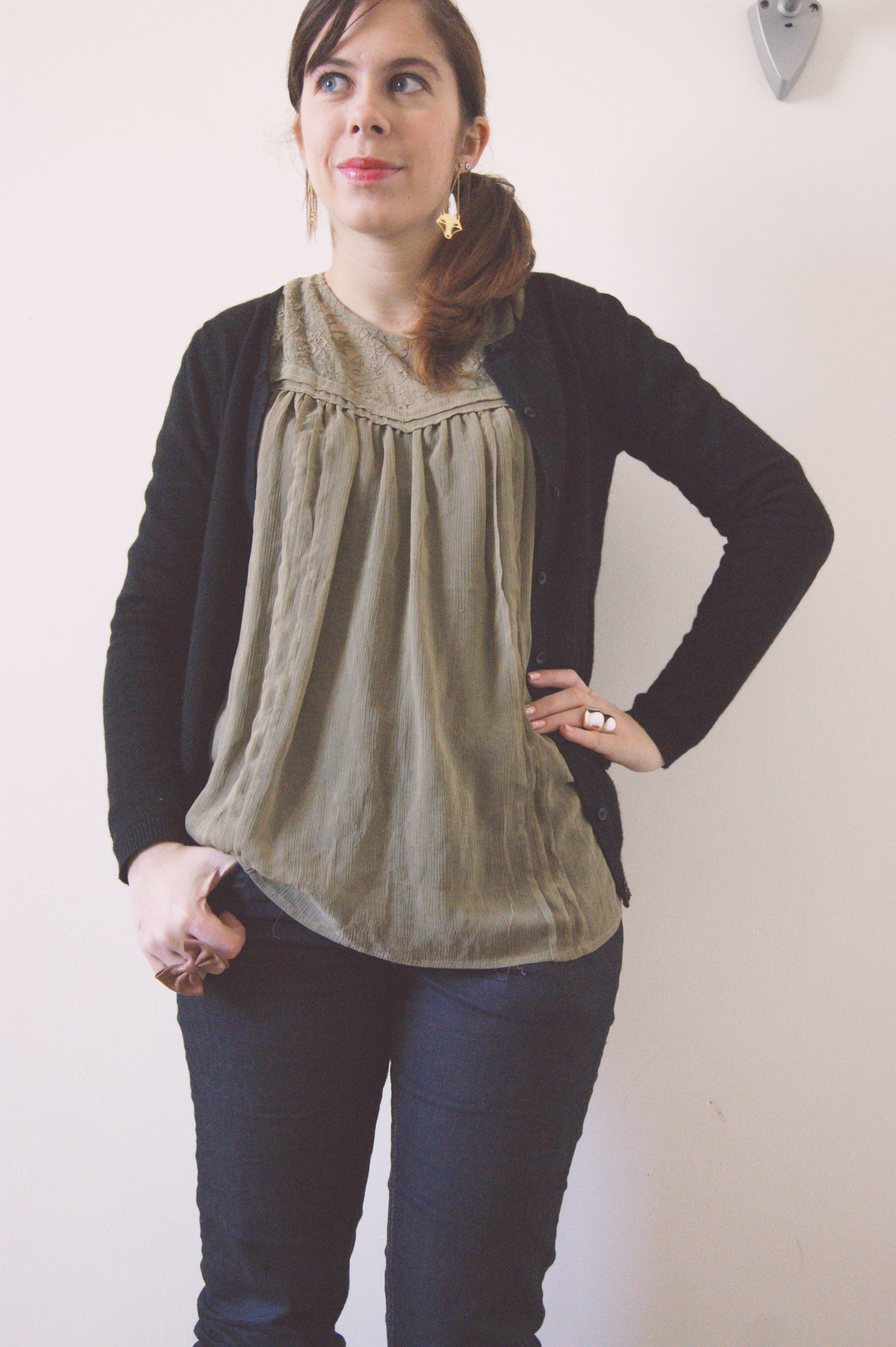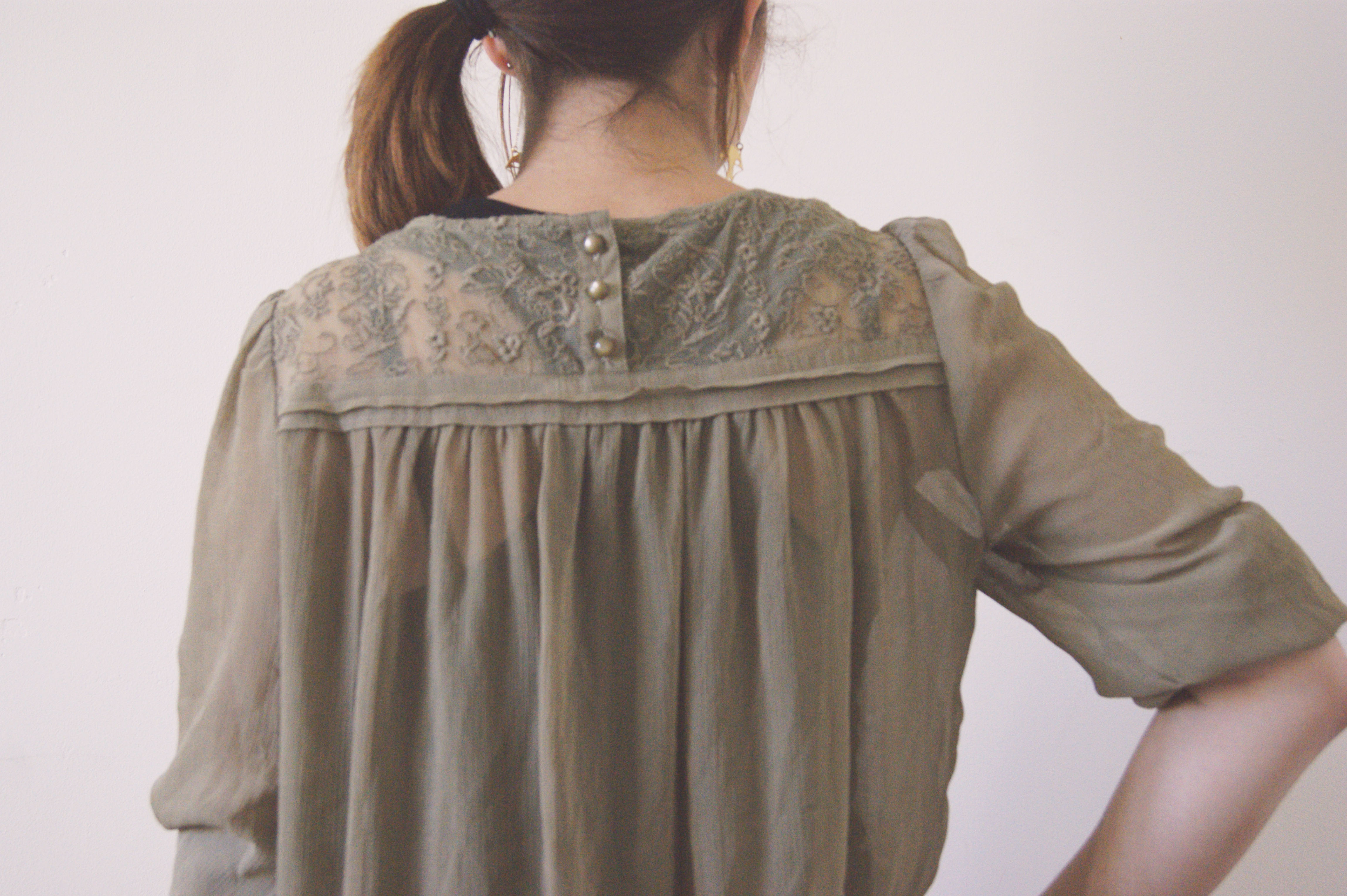 Il n’y a pas à dire, parfois, quand on fouille un peu dans son dressing, on retrouve des petites merveilles. La preuve avec ce look composé autour de ma blouse H&M kaki, que je possède depuis près de 2 ans (c’est limite du H&M vintage !) et que j’aime bien redécouvrir de temps en temps ! J’avais complètement craqué pour sa forme ample, ses jeux de transparence et pour ses petits détails brodés dans le dos. La blouse parfaite :)