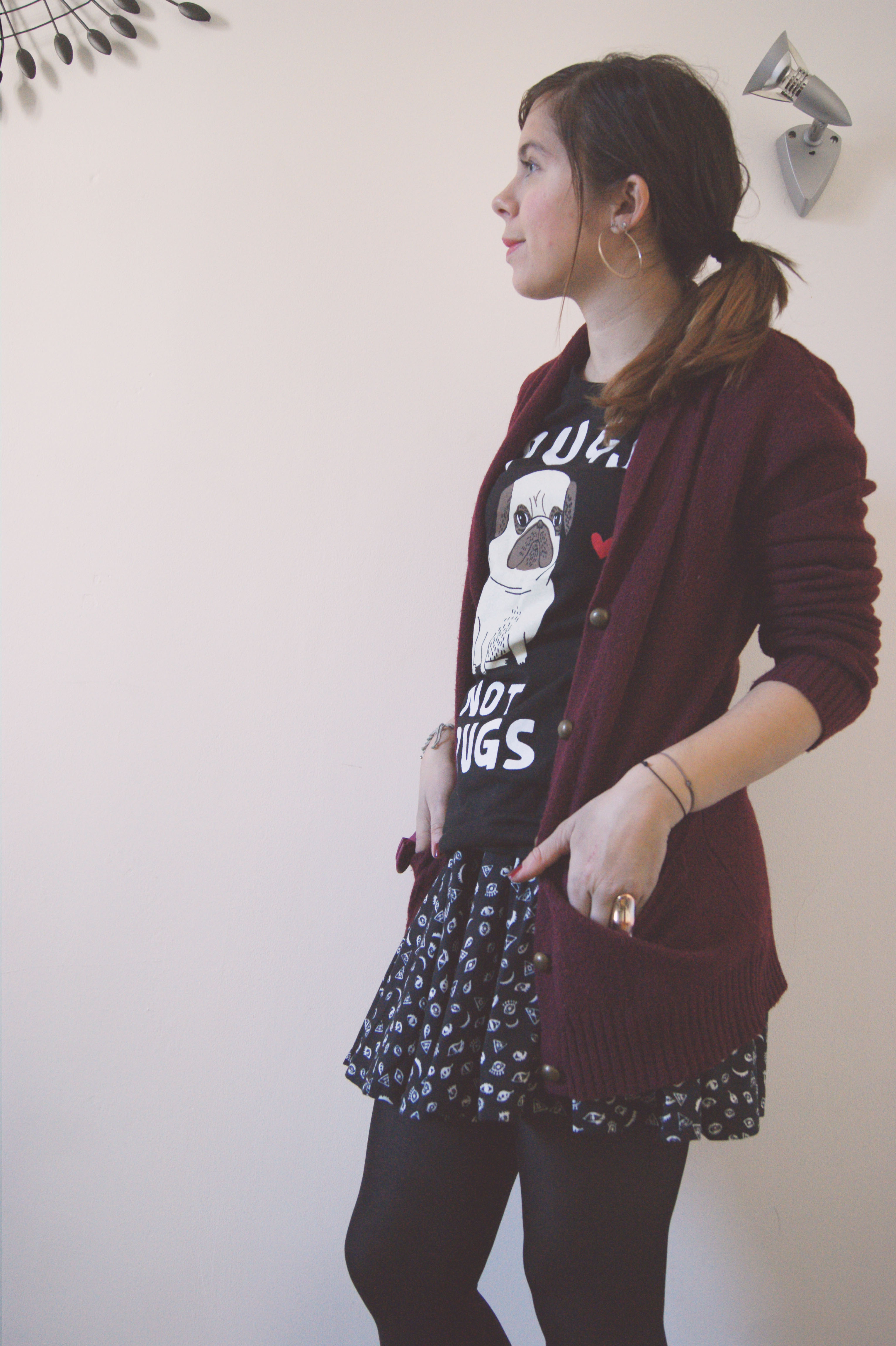 Le look d’aujourd’hui n’est pas forcément passe-partout et pourtant, il reste quand même assez facilement portable, sauf si on n’est pas vraiment tentée de jouer avec la mode (ce qui peut arriver parfois, ce qui m’arrive généralement 1 fois par semaine quand je suis en mode flemme modesque !). Sur le blog, je vous parle régulièrement d’Urban Outfitters, parce que c’est une enseigne où j’adore trouver des vêtements ou des objets de décoration super originaux. Alors quand la marque m’a proposé de me faire une petite tenue sympa pour cet hiver, j’ai foncé d’abord sur ce tee-shirt « Pugs not drugs » qui me faisait méchamment de l’oeil depuis un petit moment. Il faut dire qu’avec sa tête, ce chien est juste trop mignon (non, je ne gagate jamais devant les animaux…voyons !). Et pour aller avec, j’ai opté pour une jupe patineuse super facile à porter, malgré son imprimé « oeil » un brin.. mystique ?
