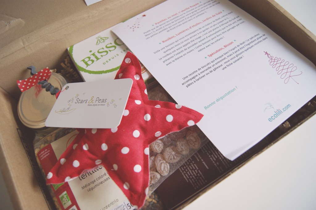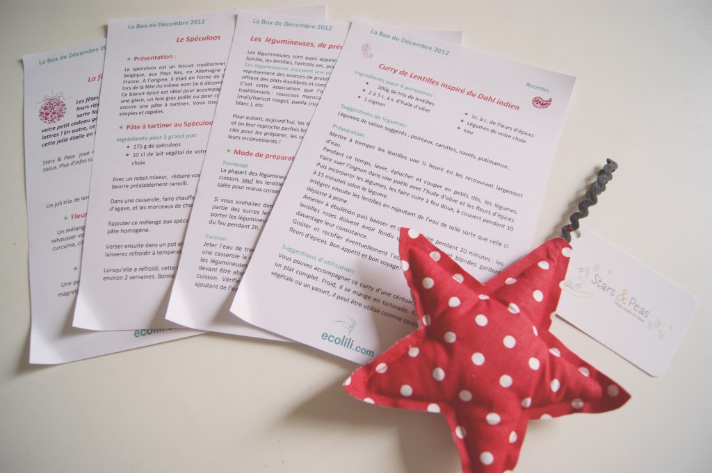 Côté ‘goodies’, on a des fiches recettes et des fiches présentants les produits. Le format est simple, mais efficace, sans chichi. Cette jolie étoile signée Stars&Peas est un chouette élément de décoration, pour ma part je l’ai mise à mon bureau mais rien ne dit qu’elle changera parfois de place pour se retrouver accrochée à une poignée de porte ou de fenêtre… :)