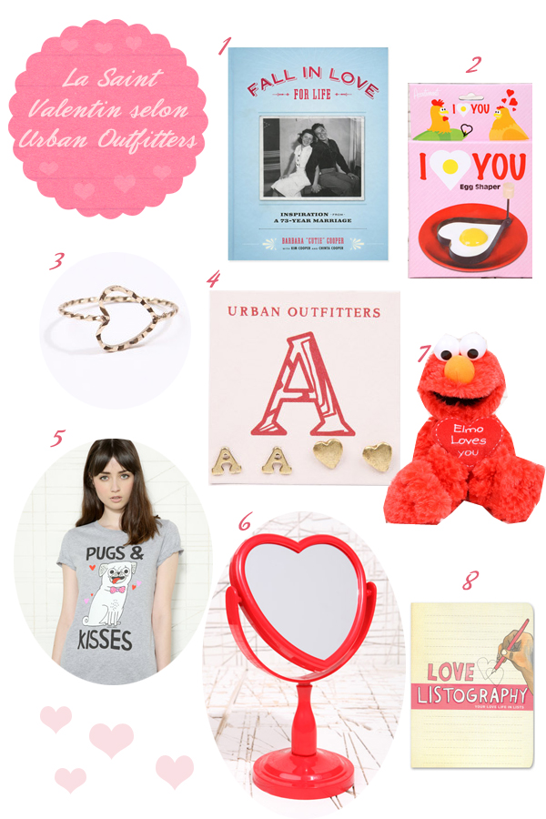 1. Livre « Fall in Love for Life » – 16€ () – 2. Moule à oeuf en forme de coeur – 8€ () – 3. Bague coeur – 8€ () – 4. Boucles d’oreilles – 11€ () – 5. Tee-shirt « Pugs&Kisses » – 37€ () – 6. Miroir en forme de coeur – 16€ () –  7. Peluche Elmo – 20€ () – 8. Livre « Lists to Love » – 16€ ()