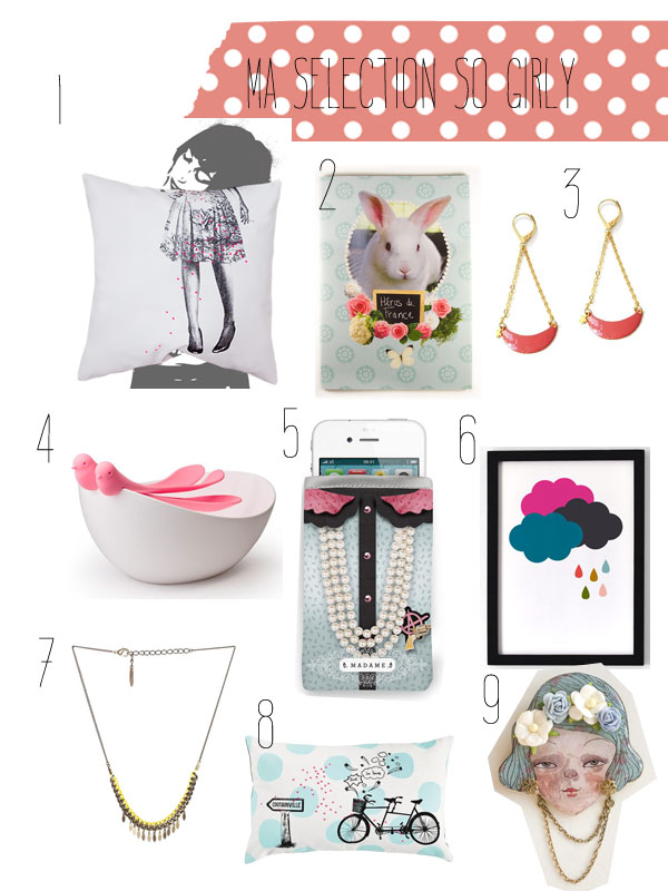 1. Coussin Alice – La Cerise sur Le Gâteau (39€ ) – 2. Carnet lapin – Héros de France (6.90€ ) – 3. Boucles d’oreilles Cassiopée – Christelle dit Christensen (34€ ) – 4. Saladier et couverts oiseaux roses – Qualy (39.90€ ) – 5. Housse de portable – Bonjour mon Coussin (13.90€ ) – 6. Affiche Nuage et pluie – Oelwein (19€ ) – 7. Collier Hanouck Citron – Constance L (45€ ) – 8. Housse de coussin tandem pois – La Cerise sur le Gâteau (39€ ) – 9. Broche – Santa Cara (29€ )