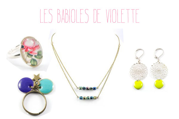 Aujourd’hui, je profite encore du fait d’avoir un blog pour vous présenter le travail d’une créatrice de bijou, Laurence. Avec sa marque Les Babioles de Violette, elle nous présente une collection de bijoux entièrement faits main, à l’esprit rétro et un brin girly, et en plus à des prix super raisonnables ! Bon point en plus, certaines pièces sont carrément tendances, avec des couleurs pop, et rien de tel pour donner un peu d’originalité à une tenue, même basique :)