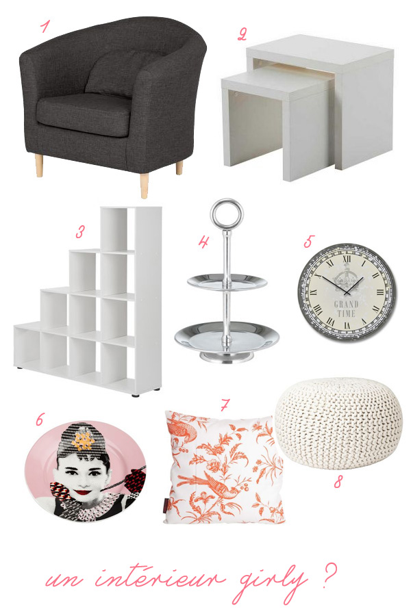 1. Fauteuil en tissu – 109€ (♥) – 2. Tables d’appoint – 65€ (♥) – 3. Bibliothèque à casiers – 119€ (♥) – 4. Plateau à 2 étages – 25.90€ (♥) – 5. Horloge – 65€ (♥) – 6. Lot de 4 assiettes à desserts Holly Golightly – 24.90€ (♥) – 7. Housse de coussin oiseaux – 28.90€ (♥) – 8. Pouf tricot – 169€ (♥)
