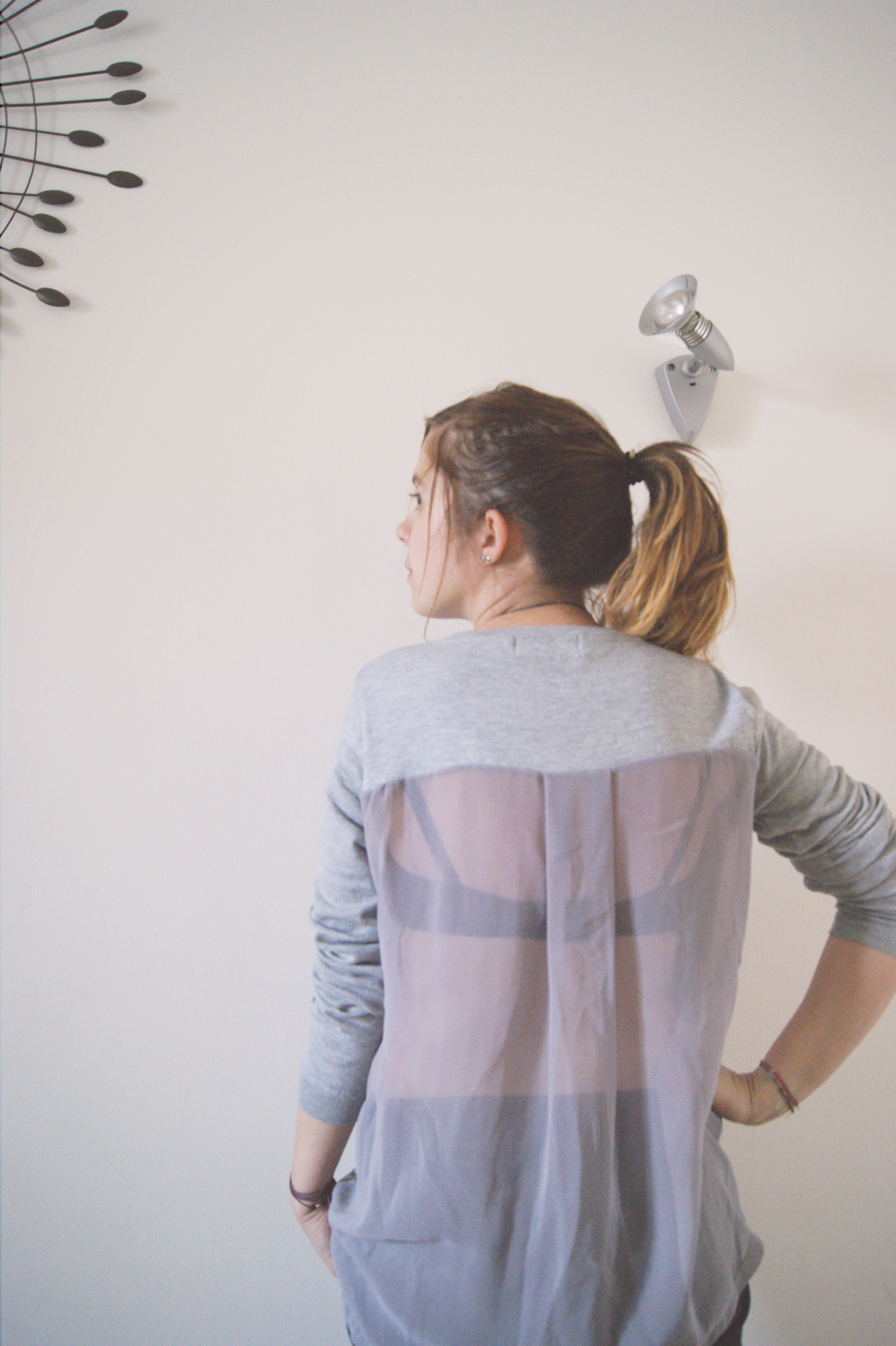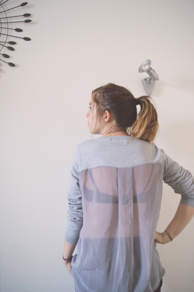 Concernant le pull que je porte dans cette tenue, je dois dire qu’il ne laisse pas indifférent ^^ Malgré son aspect très casual, le voile dans le dos change tout et franchement, c’est super d’avoir un pull un peu habillé alors qu’on porte une tenue casual à souhait ! Histoire de jouer avec le voile, j’ai joué le contraste à fond avec un soutien-gorge noir (trouvé à H&M en plus à moins de 10€, le bon plan !) mais je tenterai bien aussi avec un bandeau de couleur vive pour l’été… A méditer :)