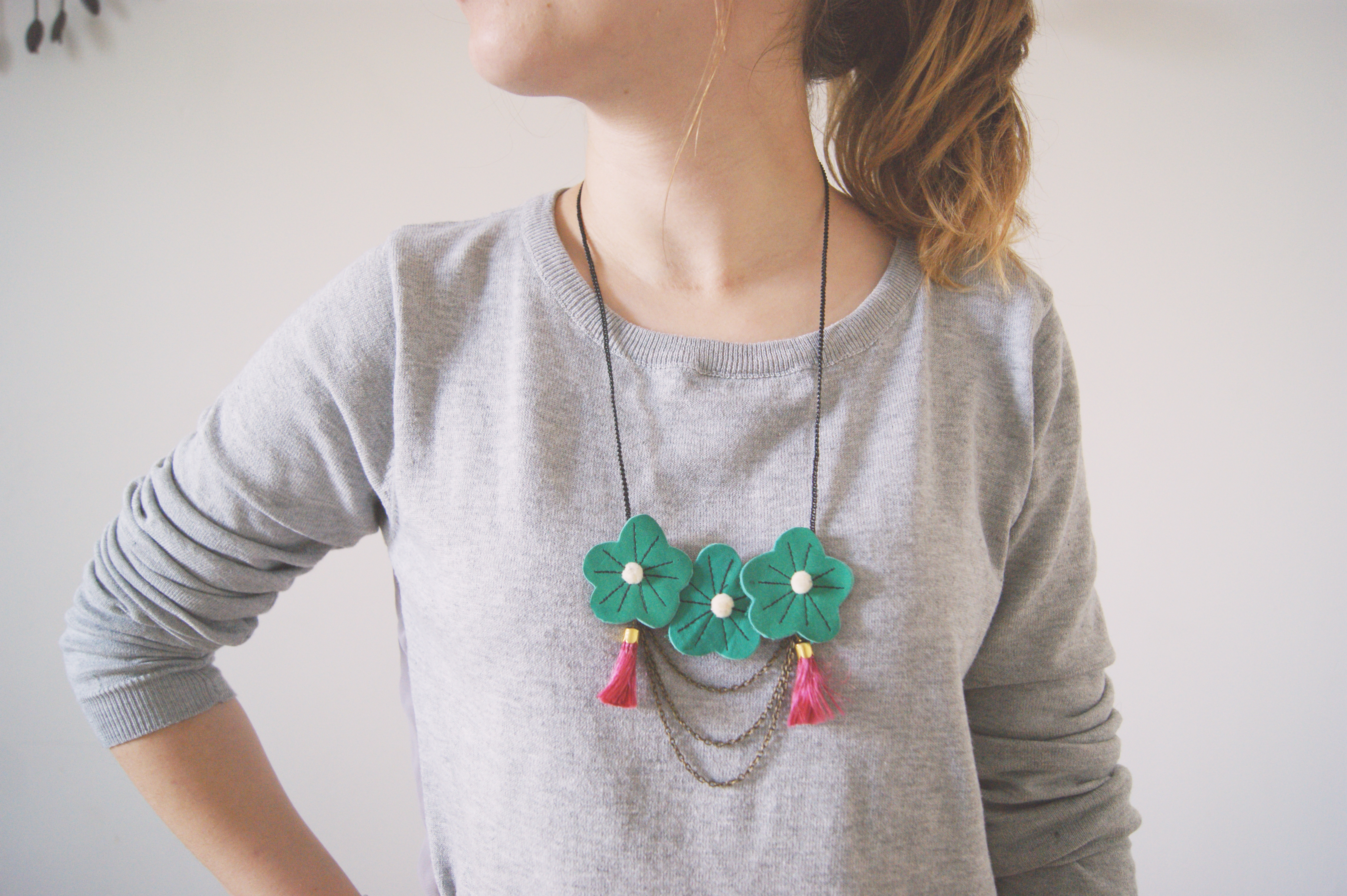 Hier matin, pas trop en avance, j’ai enfilé une de mes tenues préférées : un pull uni, un jean, des ballerines et quelques petits détails qui donnent une touche so girly à un look super casual. Et parmi ces petits détails, j’ai porté mon joli collier plastron Elufée avec ses petits pompons et ses fleurs en cuir. Quand je l’ai vu dans la boutique d’Elodie, la créatrice de la marque, j’ai immédiatement flashé dessus ! Les couleurs sont parfaites, le collier habille n’importe quelle tenue et surtout il sent bon le printemps :)