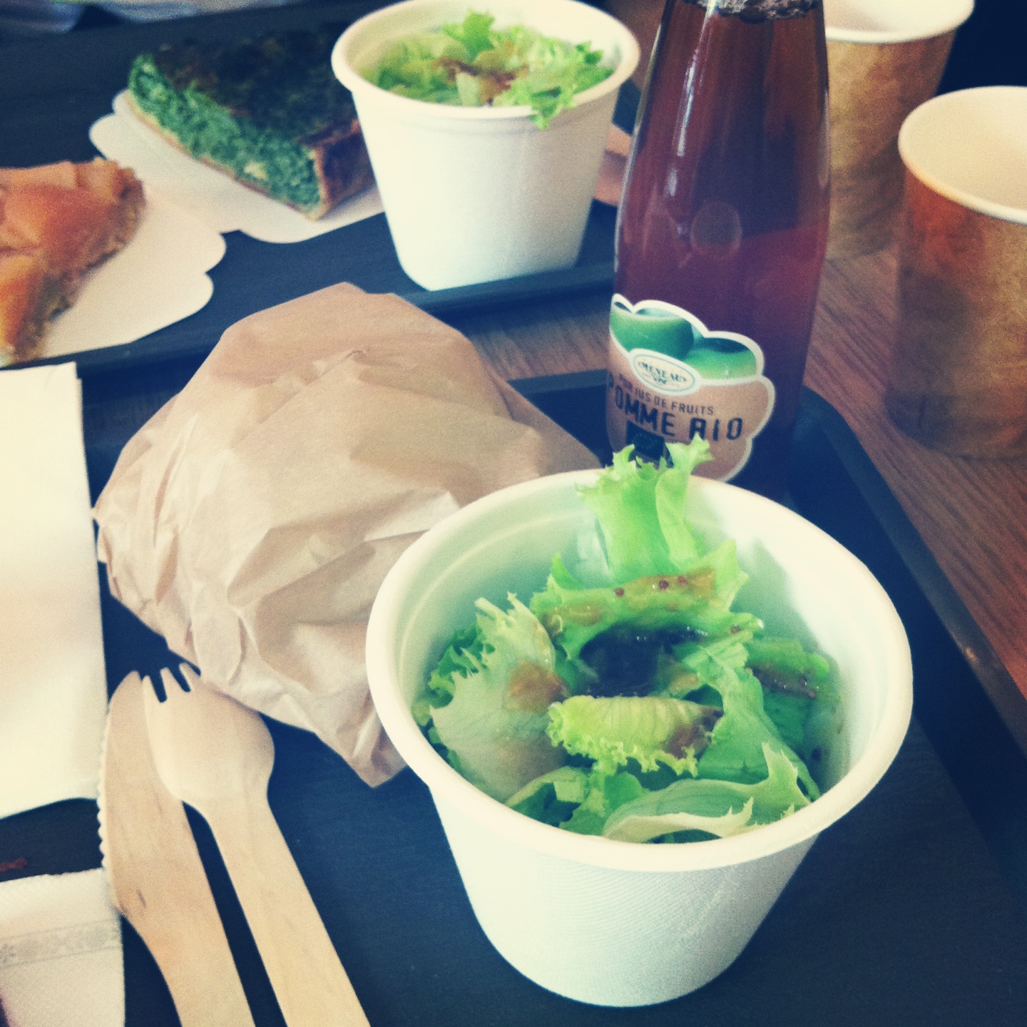 Le Green Bear Coffee, c’est un tout petit endroit avec quelques tables où l’on peut donc déguster des petits plats bio. Burgers veggie, quiches, soupes, salades, gâteaux, thé (du Lov Organic s’il vous plait !), il y en a pour tous les goûts ! Pour ma part, j’ai opté pour le menu Burger à 10.50€ avec un veggie burger (une grande première pour moi le steak végétarien !), une petite salade délicieusement assaisonné (assez rare pour le souligner !), une part de brownie et un jus de pomme bio. Même si le prix parait un peu cher, je dois avouer qu’après ça, je n’avais plus faim, même si la quiche aux épinards qu’a choisi Coralie me faisait méchamment de l’oeil ^^