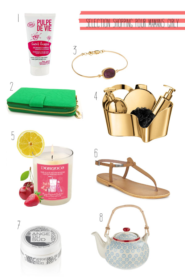 1. Le gommage/masque Sucré Frappé de Pulpe de Vie – 19.50€ (♥) – 2. Un joli portefeuille vert chez Bulle2Co – 13.90€ (♥) – 3. Un joli jonc à pierre chez Asos – 35.79€ (♥) – 4. Un assortiment de produits Sephora tout en doré ! – 25.20€ (♥) – 5. Une bougie qui sent bon le thé glacé aux fruits rouges de chez Durance, bien mieux que les Yankee Candles ! – 14.80€ (♥) – 6. Des jolies tropéziennes pour marcher tout l’été ! – 39€ (♥) – 7. Une crème pour les mains Made in Marseille signée Ange du Sud chez 1 Touche 2 Beauté – 9€ (♥) – 8. Une jolie théière Bloomingville dénichée chez Zalando ! – 30€ (♥)