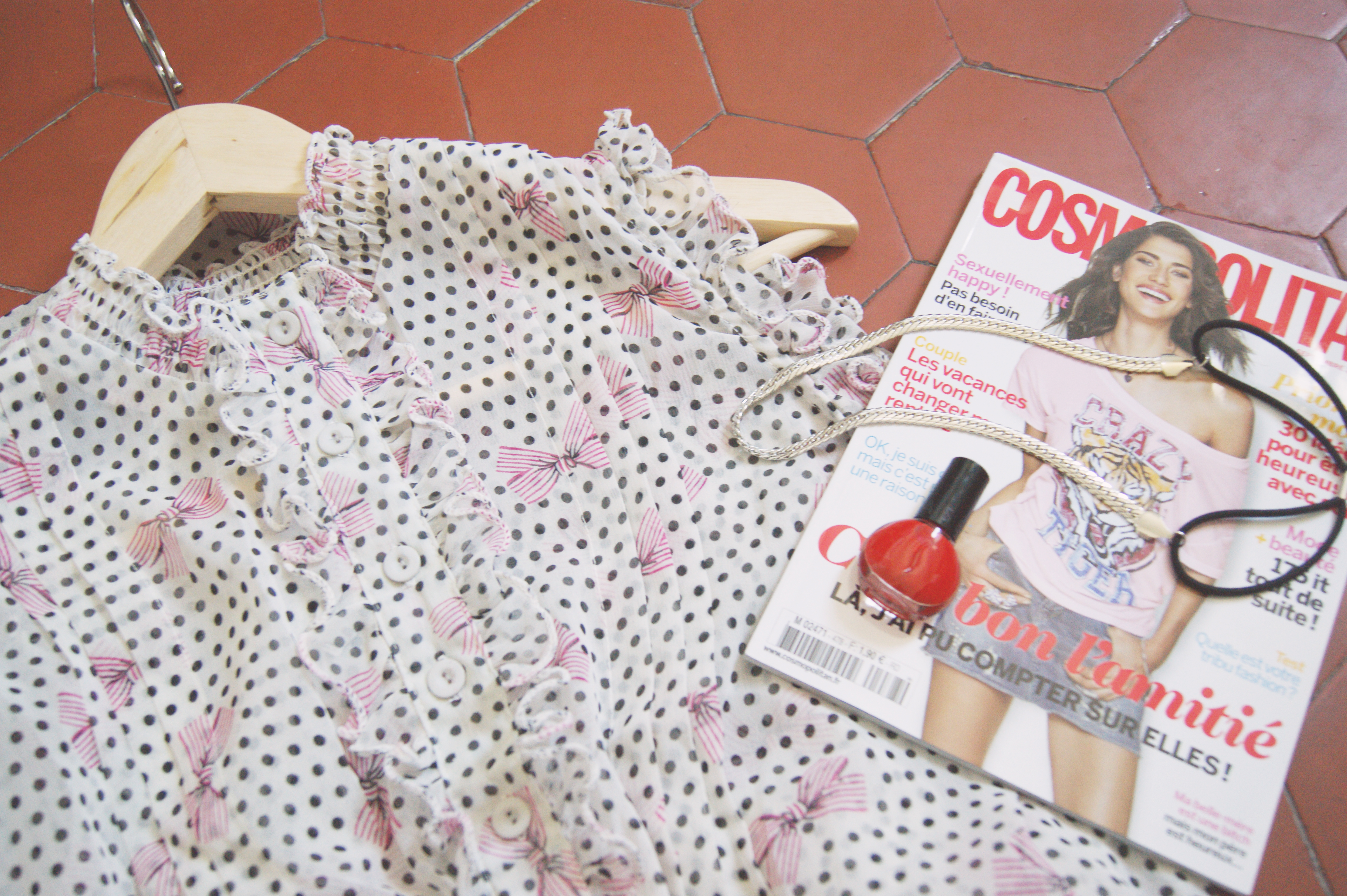 ♥ Une robe à froufrous et imprimé girly, sans marque. J’aime beaucoup l’imprimé mais les froufrous et la coupe ne me vont pas du tout malheureusement, elle me rend plus cucul que girly (désolée pour l’expression… ^^). Pour avoir regardé sur le site de Mademoiselle Fashion suite à la réception de ma box, je me suis rendue compte qu’ils vendaient en fait pas mal de vêtements sans marque, que l’on retrouve chez les chinois dans les grandes villes. Et là, ça me gêne un peu de payer une box 30€ pour avoir ce genre de produits qui, quand même, n’a pas une qualité exceptionnelle… Bref, si je suis douée de mes deux mains, je vais peut être essayer de transformer la robe en blouse parce que je craque quand même pour son imprimé.