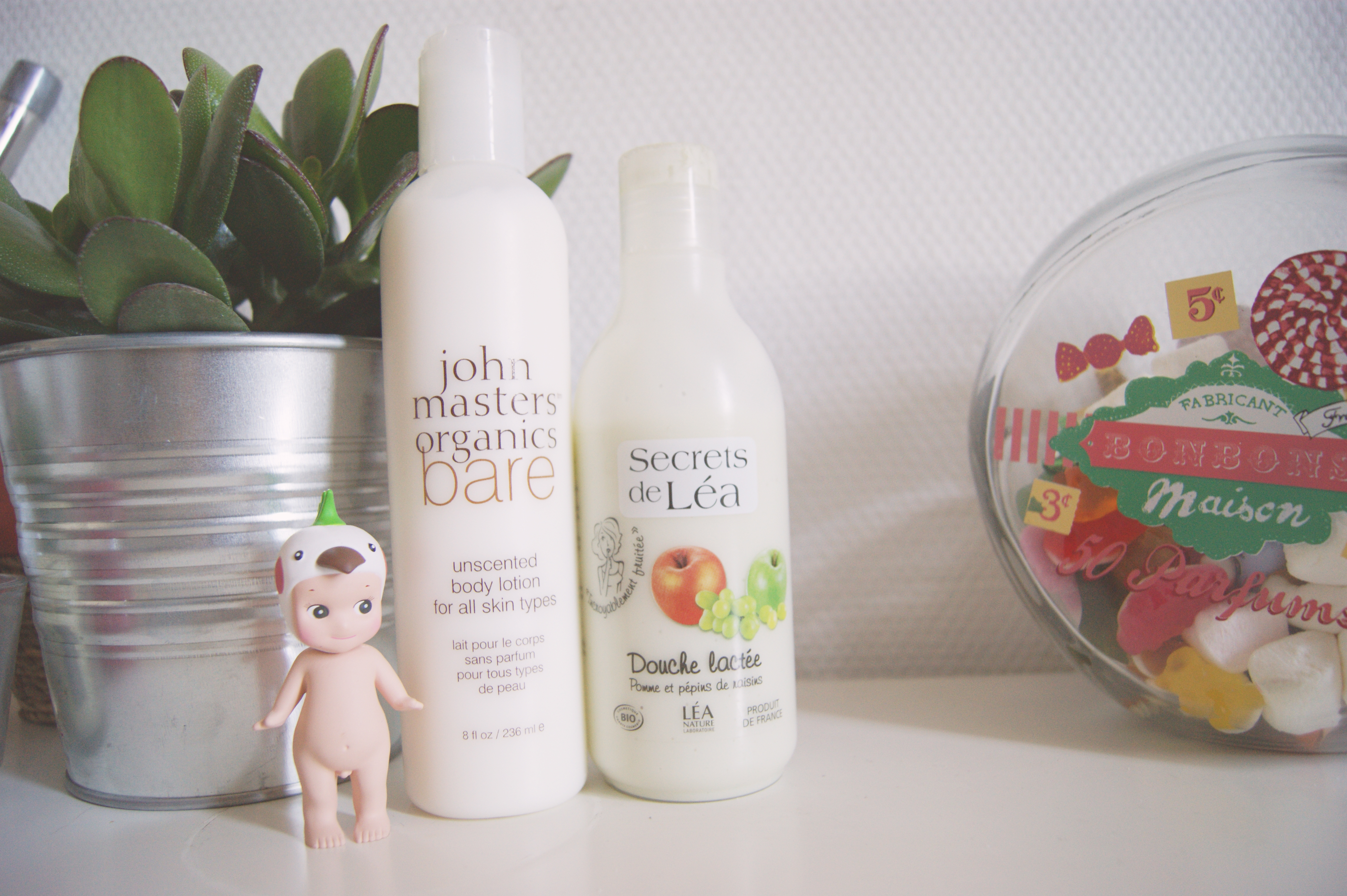 J’ai une allergie au parfum dans les cosmétiques. Autant vous dire que pour me laver et pour nourrir ma peau, je dois faire super attention sous peine de me retrouver couverte de plaques (instant glamour, bonjour !). Il y a quelques semaines, j’ai reçu de la part du site Mon Corner Bio le lait pour le corps sans parfum de la marque John Masters Organics. Sa texture légère permet au lait de pénétrer rapidement dans la peau et celle-ci est vraiment bien hydratée. Par contre, il y a une espèce d’odeur un brin pharmaceutique qui peut gêner, pour ma part j’ai l’habitude de ce genre de produits donc cela ne me dérange pas. Et sous la douche, j’ai adopté le gel douche pommes et pépins de la marque Secrets de Léa ! C’est un gel douche lacté, résultat il hydrate déjà pas mal la peau sous la douche et surtout il laisse une odeur très agréable de fruits sur la peau, j’adore :) Et pour ne rien gâcher, ces deux produits contiennent des ingrédients issus de l’agriculture bio.