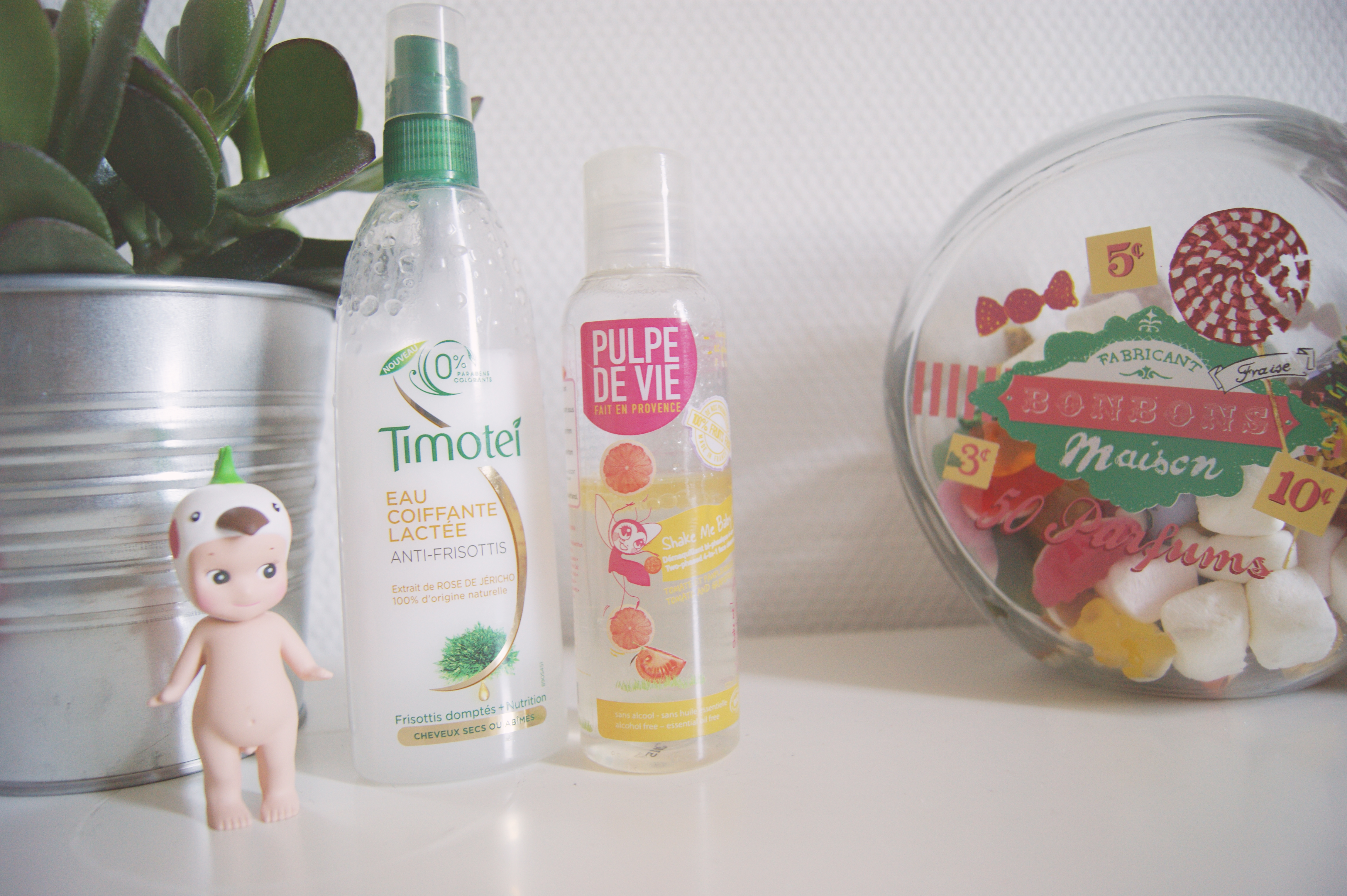Pour me démaquiller, je ne me passe plus du Shake Me Baby de Pulpe de Vie ! J’en ai déjà parlé sur le blog il y a quelques semaines, donc si vous voulez tout savoir sur lui, je vous invite à lire mon test :) Et pour mes cheveux, j’ai adopté l’eau coiffante lactée anti-frisottis de la marque Timotei. Depuis que je ne les lisses plus, j’avoue que parfois, certains matins les frisottis me donneraient envie de dégainer mon fer à lisser, mais au lieu de ça, je pschiiitttee un peu l’eau lactée sur mes cheveux et je coiffe selon mon envie afin de les dompter. Ca les discipline tout en les nourrissant et en plus il n’y a pas de parabens dedans :)
