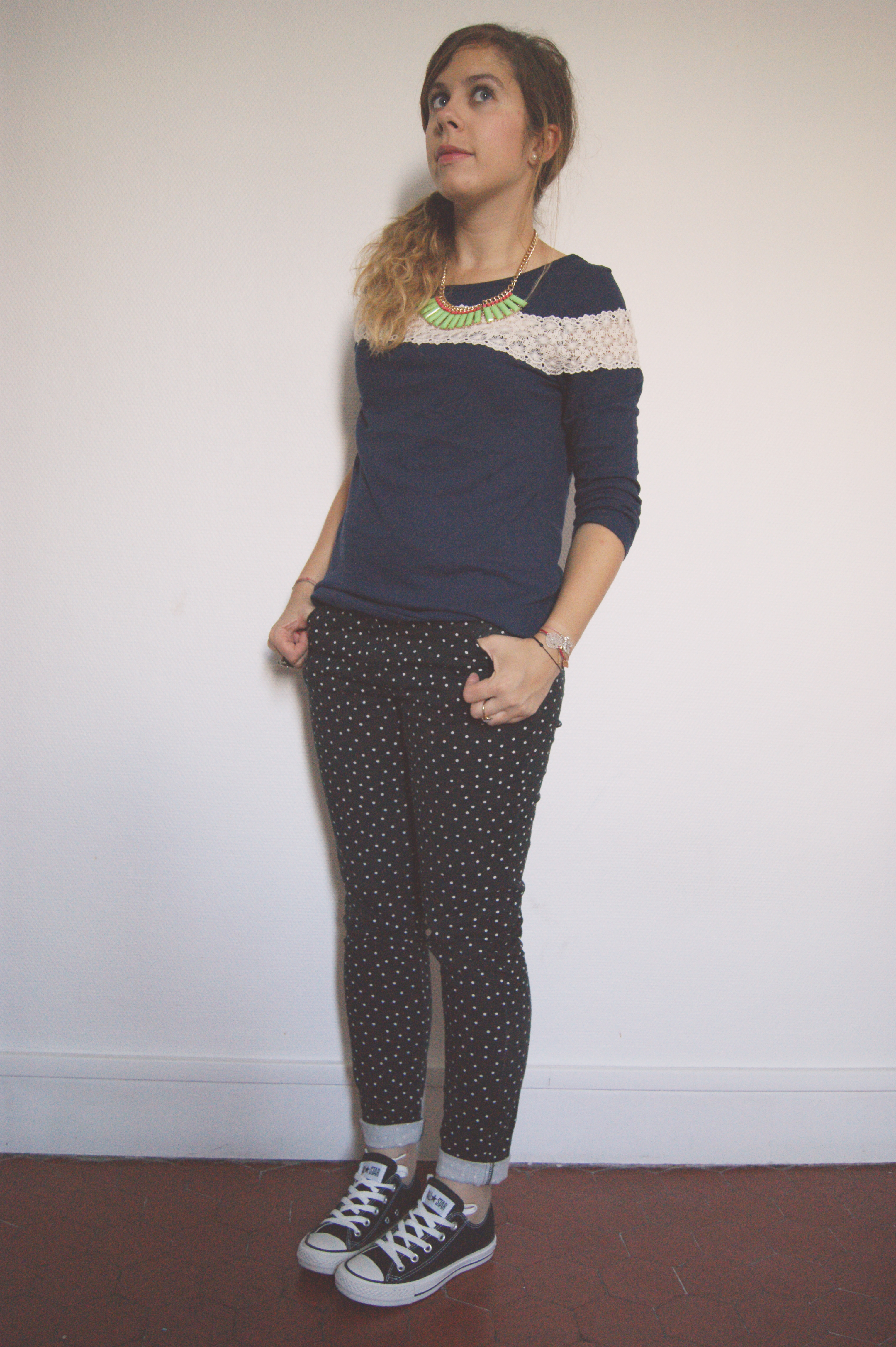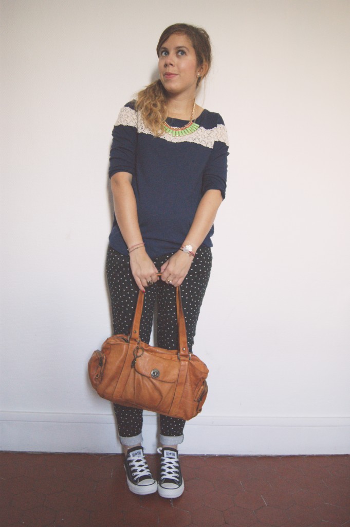 Jean à pois + converse j’aime beaucoup ! Mais un peu moins la dentelle sur le pull…