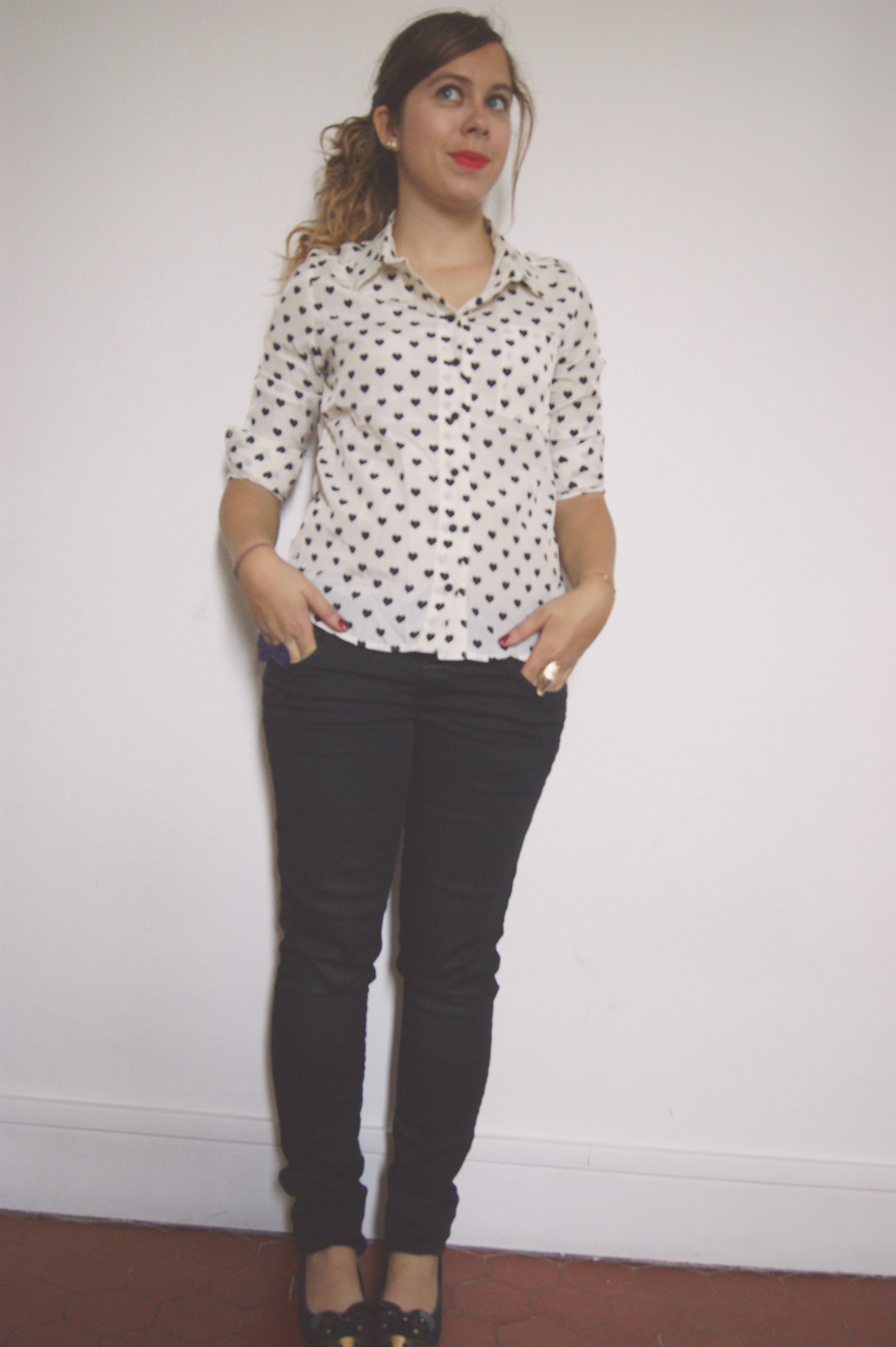 Je suis complètement accro aux imprimés coeur également. et je craque sur tes ballerines souris! Bref, je suis fan de tout ce qui est sobre…
