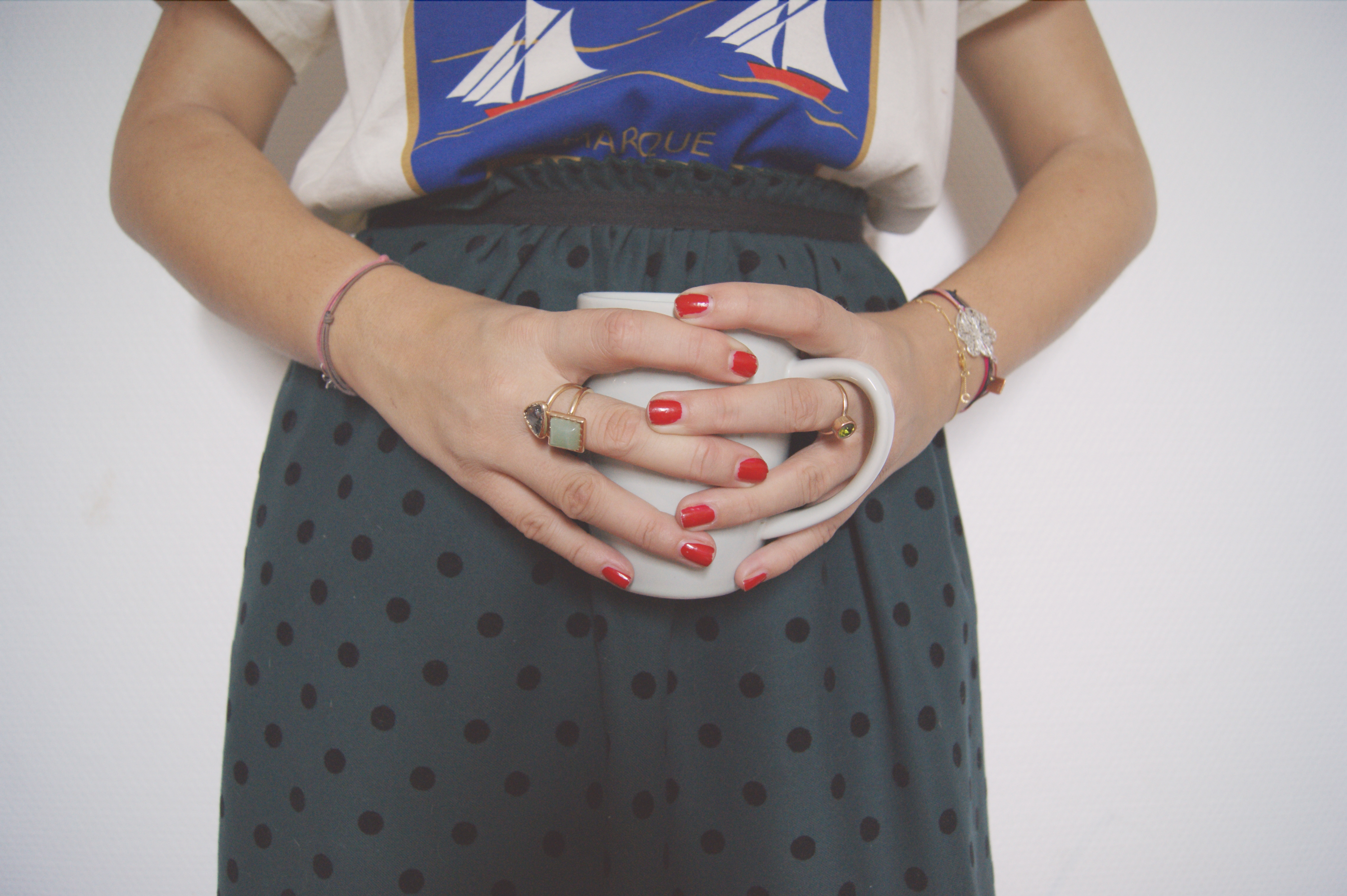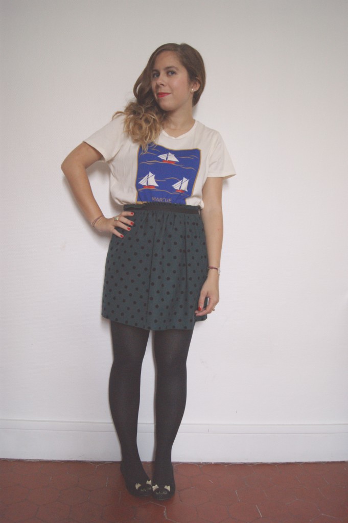 L’avantage du retour des mauvais jours, c’est que je peux ressortir certaines pièces que vous avez déjà vues sur le blog à maintes reprises l’année dernière, comme cette jupe Naf Naf à pois. J’en suis folle et tant que je pourrai rentrer dedans, eh bien je la porterai même si un jour les pois deviennent has been. A vrai dire, quand j’ai une pièce chouchou, peu importe que ce soit tendance ou pas, je vais la porter parce que je n’aime pas forcément être un mouton de la mode (sinon vous auriez vu sur le blog des choses tendances comme la collection Pimkie x Camille Over The Rainbow…). Et pourtant on pourrait me dire que je suis un mouton à cause du tee-shirt porté dans le look aujourd’hui, vu qu’on l’a vu sur pas mal de blogs mode ces derniers mois. Mais bon je ne vais pas m’empêcher non plus d’adopter certaines pièces tendances… Disons qu’elles doivent juste coller à mon style ^^