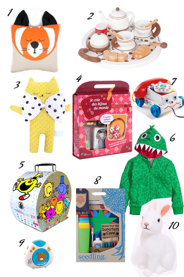 1. Coussin Panda Roux – Nobodinoz (25.95€ ♥) – 2. Dinette « Petit Déjeuner » en bois – Janod (46€ ♥) – 3. Peluche chat – Youttle (37€ ♥) – 4. Kit « Je crée mes bijoux du monde » – Nature & Découvertes (15.95€ ♥) – 5. Coffret collector « Monsieur et Madame » – Amazon (18€ ♥) – 6. Sweat à capuche – H&M Kids (9.95€) – 7.Téléphone vintage – Fisher Price (19.95€ ♥) – 8. Kit « Crée ta cape de super héros » – Petit Hood (45€ ♥) – 9. – Lumi Merveille – Vtech (18€ ♥) – 10. Lampe lapin – Urban Outfitters (12€ ♥)