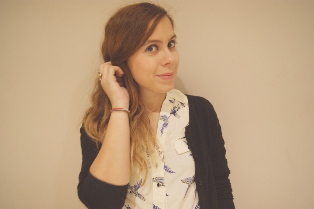 Cette chemise, j’avais flashé dessus pour son motif, de jolis oiseaux bleus un brin japonisant. D’ailleurs, j’ai bien envie de craquer pour de nouvelles chemises avec des motifs sympas, ou même de me trouver une chemise en coton bleu, comme celle que j’avais il y a de ça quelques années mais qui, à force d’être portée, m’a quittée ^^ Un cardigan par dessus parce que le froid est arrivé dans le Sud (brrrrrrrrrr) et voila, le tour est joué !!! Et côté accessoires, deux nouveautés qui font leur entrée dans mon dressing (gniiiiii) : une nouvelle paire de ballerines Anniel et un sac sur lequel je bavais littéralement depuis des mois, le Dorothy de Nat&Nin en vert, dans le cadre d’un partenariat avec RueDuCommerce ♥