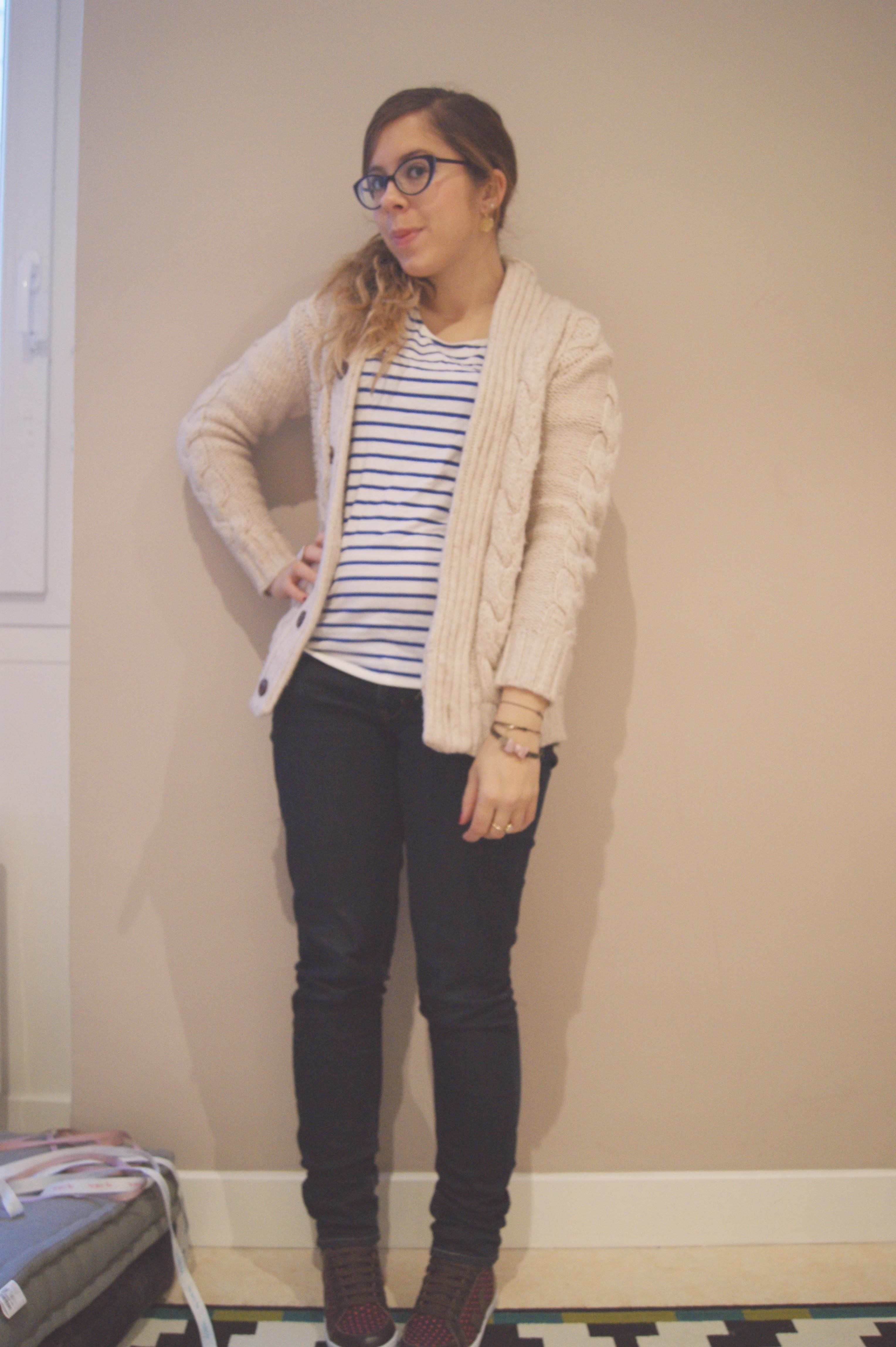 Parmi les pièces que j’ai hésité longuement à garder ou à mettre dans les pièces à donner, il y a ce gilet. Acheté l’année dernière chez Zara Enfants, j’ai du mal à apprivoiser son côté « garçon » et le fait qu’il ne souligne pas vraiment les formes. Souvent, quand je le porte avec une robe, j’ai plus l’impression d’avoir une couette en laine sur le dos qu’un gilet qui rend l’ensemble élégant. Mais voilà, l’autre matin, je chope ma marinière, mon jean et mes nouvelles baskets Veja offertes par l’amoureux à Noël, et je me dis que le gilet irait bien avec… Résultat, je suis embêtée, je sais plus quoi faire ^^ (comme pour la moitié de mon placard haha). Garder ? Jeter ? En voilà une très bonne question ;)