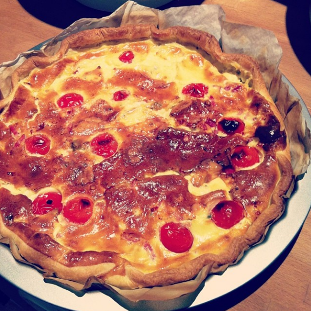 Sur le fond de tarte, mettez les tomates cerises et les lardons crus, puis versez la préparation et enfournez pendant 35 minutes !