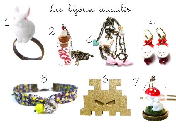 1. Bague Lapin Blanc – 9.90€ (♥) – 2. Sautoir fiolle candy cane – 29€ (♥) – 3. Sautoir licorne blanche – 45€ (♥) – 4. Boucles d’oreilles Geisha – 15€ (♥) – 5. Bracelet liberty – 14.90€ (♥) – 6. Bague space invaders dorée – 12.90€ (♥) – 7. Sautoir forêt enchantée – 44.90€ (♥)
