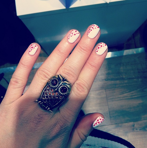 Pour ma part, ça m’a permis d’expérimenter le vernis à ongles blanc, une couleur qui m’a toujours tentée mais que je n’ai jamais osé tester, parce que ça me rappelle un peu quand j’étais plus jeune et qu’avec les copines, en classe on se faisait des manucures au blanco ! (Que la première qui n’ait jamais fait ça se dénonce ! Ca marche aussi avec les stabilo ^^). Bref, j’ai pu avoir ce soir là une manucure « so girly », sur une base de vernis blanc OPI, des petits points roses et rouges ont été dessinés. Et j’ai adoré cette manucure, ça me change pas mal de ce que je fais d’habitude car je ne fais jamais de nail-art. Merci mes deux mains gauches ;)